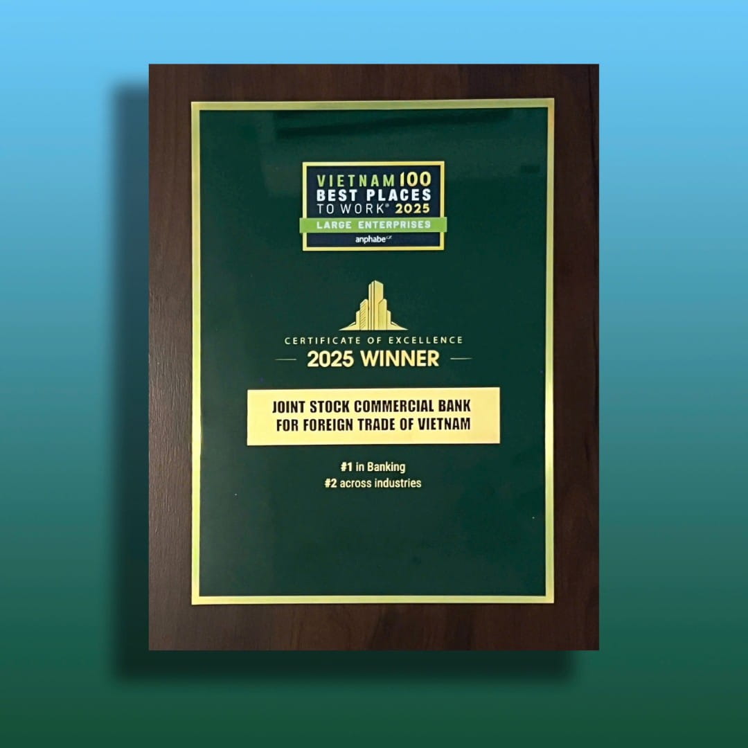 Certificate of “Best Place to Work in Việt Nam 2025” — Vietcombank retains its position as No.1 in the banking sector and No.2 nationwide