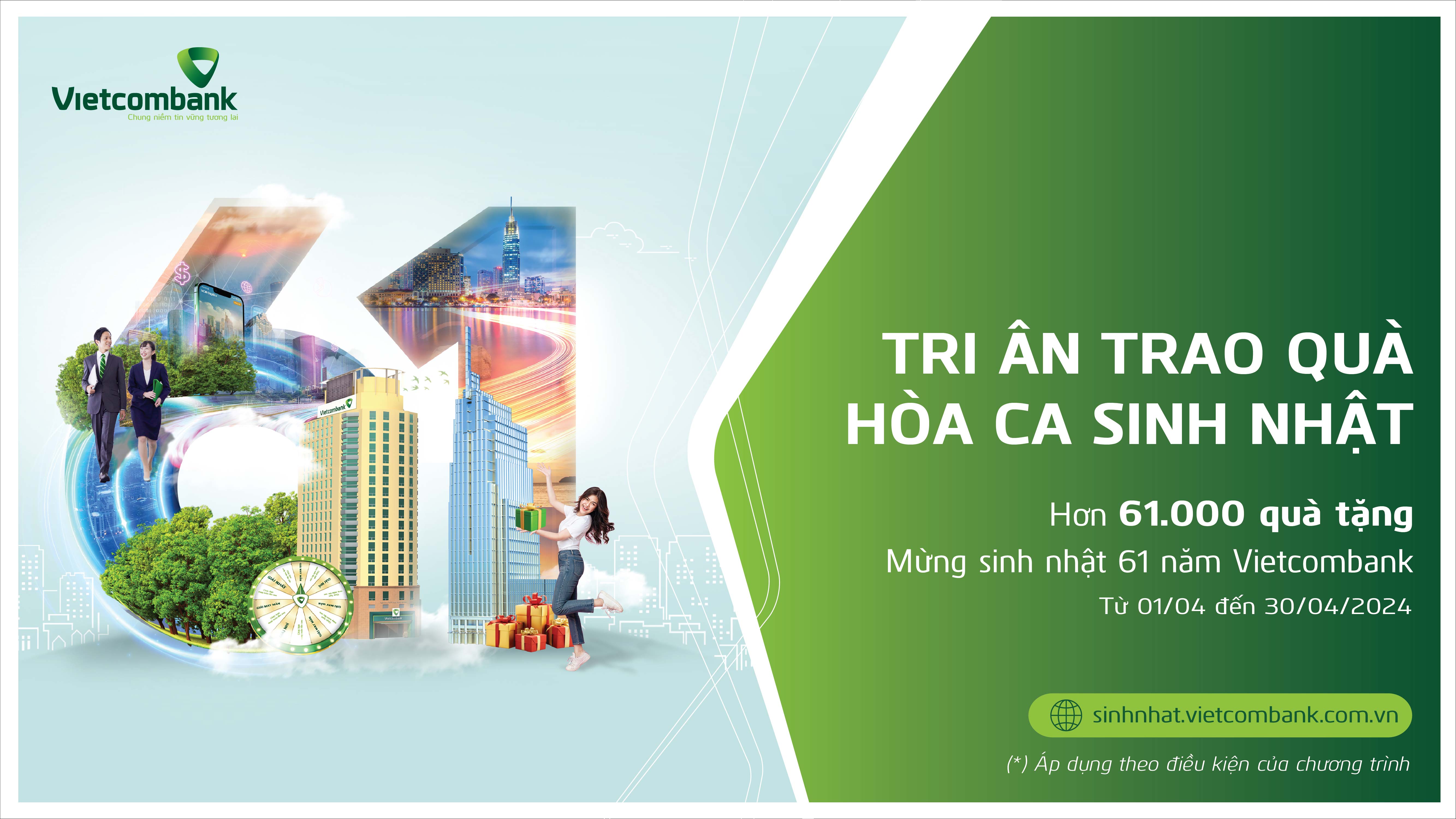 Nhân dịp sinh nhật 61 năm, từ ngày 01/04 đến ngày 30/04/2024, Vietcombank triển khai chương trình khuyến mại “Tri ân trao quà – Hòa ca sinh nhật” với hơn 61.000 quà tặng hấp dẫn.
