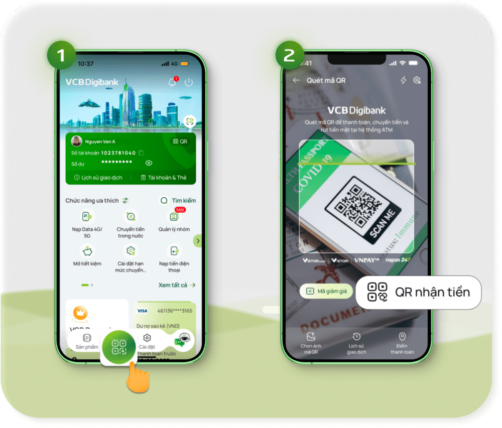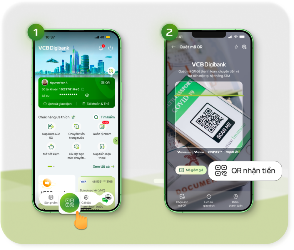 • Bước 2: Tại trang chủ >> Chọn tính năng quét QR >> Chọn QR nhận tiền