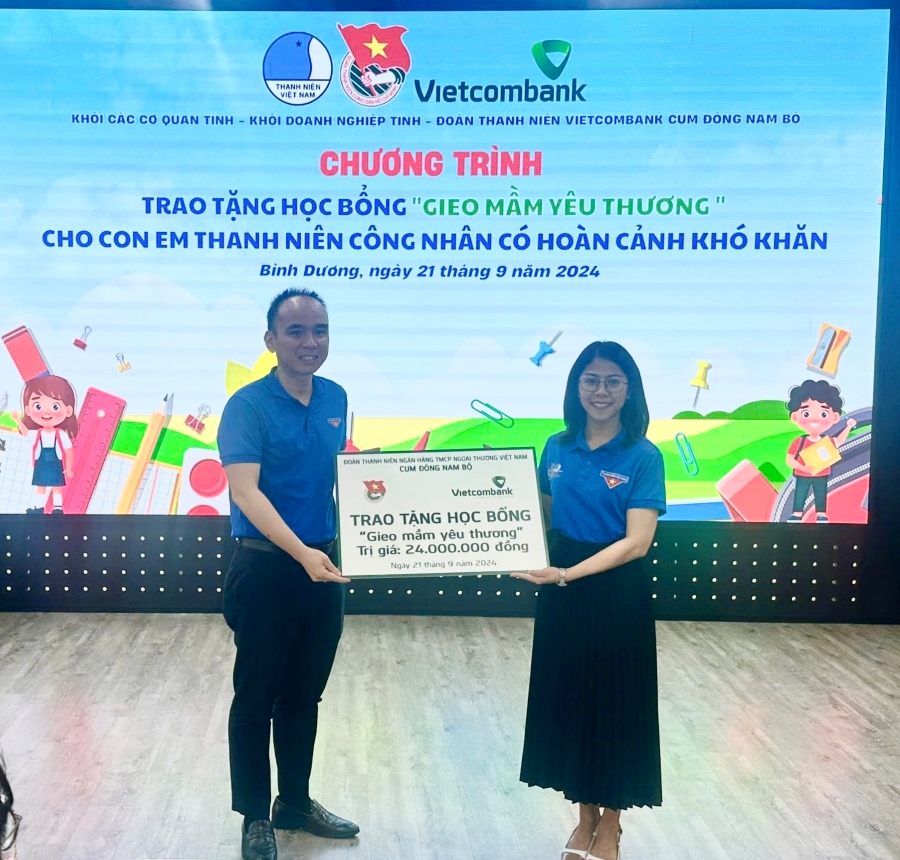 Ông Phạm Trần Trung Hiếu - Ủy viên BTV Đoàn Vietcombank, Bí thư Đoàn thanh niên Vietcombank Bình Dương trao bảng tượng trưng 20 suất học bổng cho đại diện Đoàn khối cơ quan và Đoàn khối Doanh nghiệp tỉnh Bình Dương