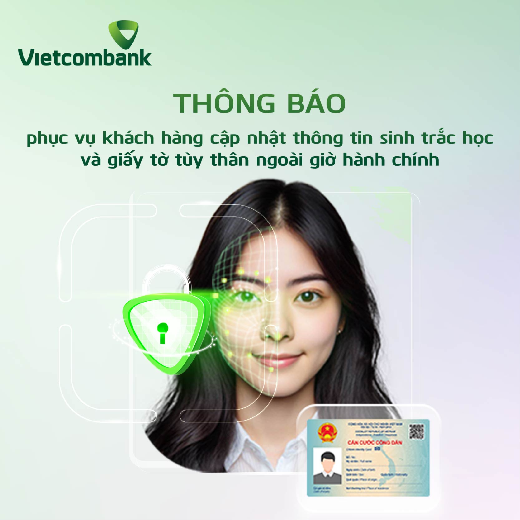 Vietcombank kính mời Quý khách hàng dành thời gian thực hiện cập nhật thông tin sinh trắc học và thông tin giấy tờ tùy thân ngay trên ứng dụng ngân hàng số VCB Digibank hoặc đến trực tiếp tại các điểm giao dịch của Vietcombank để được hỗ trợ, vui lòng mang theo căn cước/căn cước công dân gắn chip còn hiệu lực khi đến giao dịch.