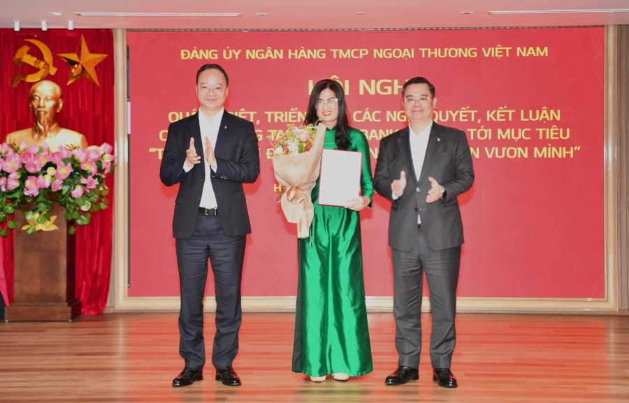 Đ/c Nguyễn Thanh Tùng - Ủy viên Ban Chấp hành Đảng bộ Chính phủ, Bí thư Đảng ủy, Chủ tịch HĐQT (ngoài cùng, bên phải) và đ/c Lê Quang Vinh - Phó Bí thư Đảng ủy, Tổng Giám đốc (ngoài cùng, bên trái) trao quyết định và tặng hoa cho đ/c Lê Hồng Vân - tân Phó Trưởng Trung tâm đổi mới sáng tạo Vietcombank