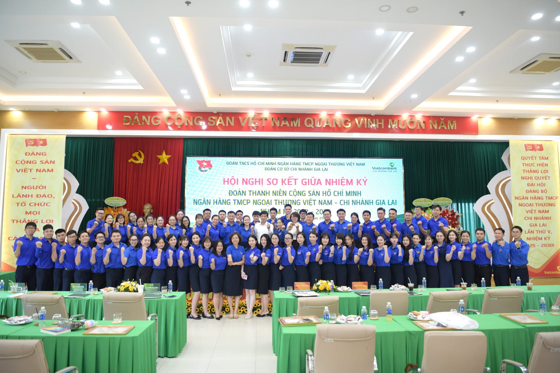 BCH Đoàn cơ sở Vietcombank Gia Lai nhiệm kỳ 2022-2027 chụp hình cùng đại biểu và khách mời tại hội nghị