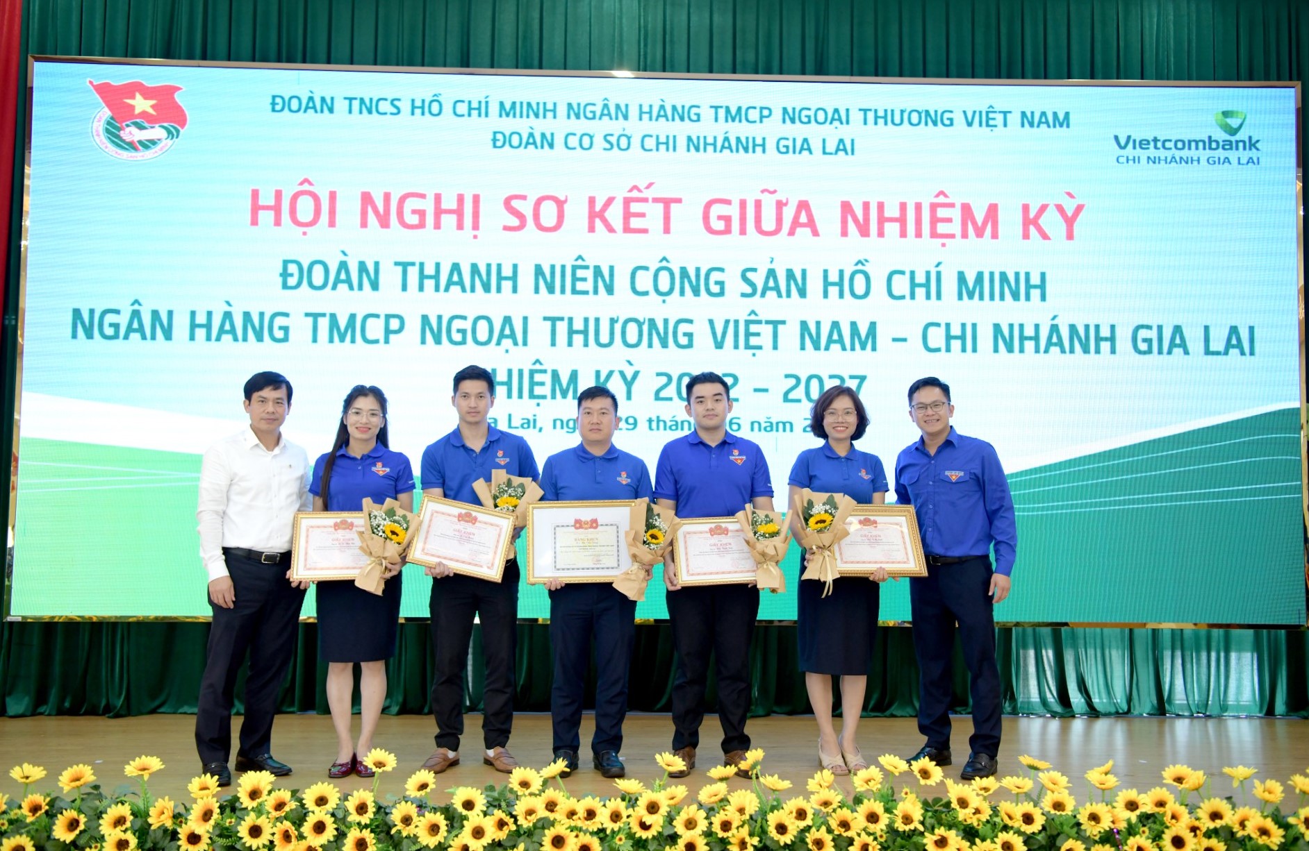 Đồng chí Nguyễn Minh Tuân - Uỷ viên BCH Đảng bộ Vietcombank Gia Lai, Phó Giám đốc chi nhánh, Chủ tịch công đoàn cơ sở (ngoài cùng bên trái), đồng chí Lê Xuân Dũng - Ủy viên BCH Đoàn Vietcombank, Cụm trưởng Cụm hoạt động Đoàn khu vực Nam Trung Bộ và Tây Nguyên (ngoài cùng bên phải) trao giấy khen và hoa cho các đồng chí có thành tích trong công tác Đoàn và phong trào thanh niên năm 2024 cấp Đoàn Khối Doanh nghiệp Trung ương và cấp Đoàn Vietcombank
