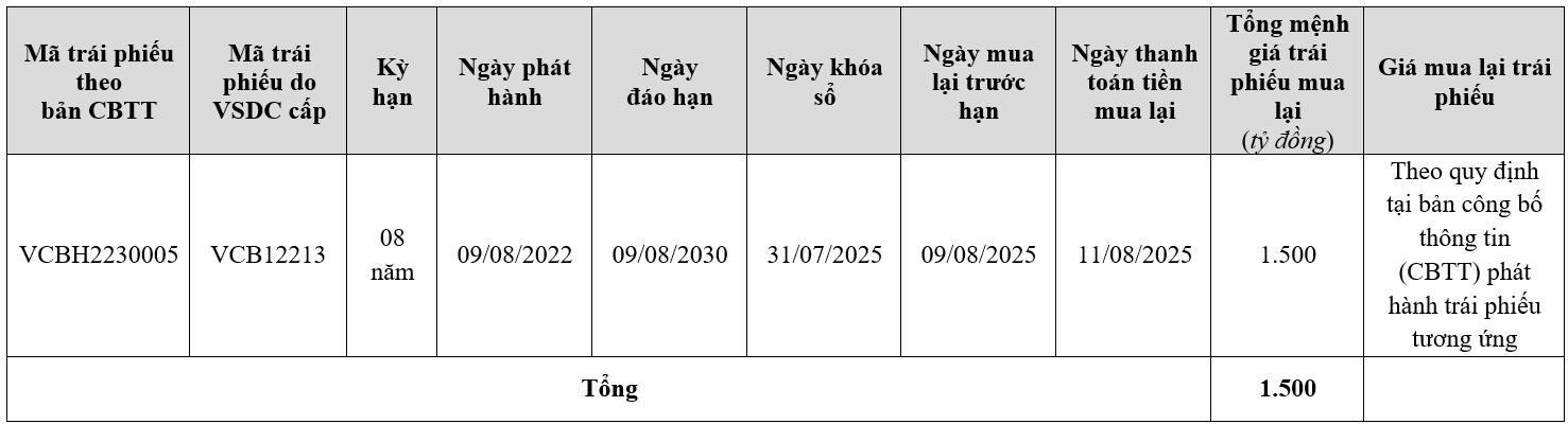 Ngày mua lại trước hạn theo bản CBTT là ngày 09/08/2025, tuy nhiên do ngày 09/08/2025 và 10/08/2025 là ngày nghỉ nên theo quy định tại bản CBTT, ngày thanh toán tiền mua lại là ngày 11/08/2025.