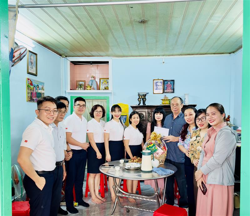 Bà Nguyễn Thị Tố Hương - Chủ tịch Công đoàn cơ sở, Phó giám đốc Chi nhánh (thứ 3, từ trái sang); bà Huỳnh Thị Mỹ Anh - Bí thư Đoàn thanh niên (thứ 7, từ phải sang); bà Phạm Thị Thúy Hà - chủ tịch Ủy ban MTTQ Việt Nam phường Tân Mỹ (thứ 3 từ phải sang) và đại diện BCH Công đoàn cơ sở và Đoàn Thanh niên thăm, tặng quà quà cho thương binh Nguyễn Viết Thụ