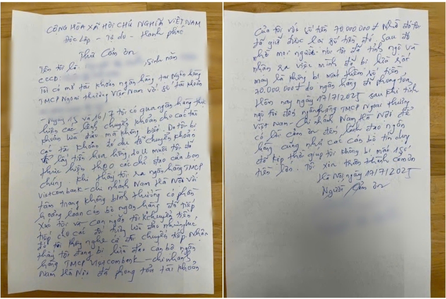Sáng ngày 177/2025, khách hàng đã trở lại Phòng giao dịch Kim Đồng - Vietcombank Nam Hà Nội để thực hiện chuyển trả lại tiền cho người đã cho khách hàng vay chiều hôm qua, đồng thời vui vẻ cảm ơn Ngân hàng đã giúp khách hàng giữ lại được số tiền bảy mươi triệu đồng trong tài khoản kèm theo bức thư cảm ơn do khách hàng viết tay.