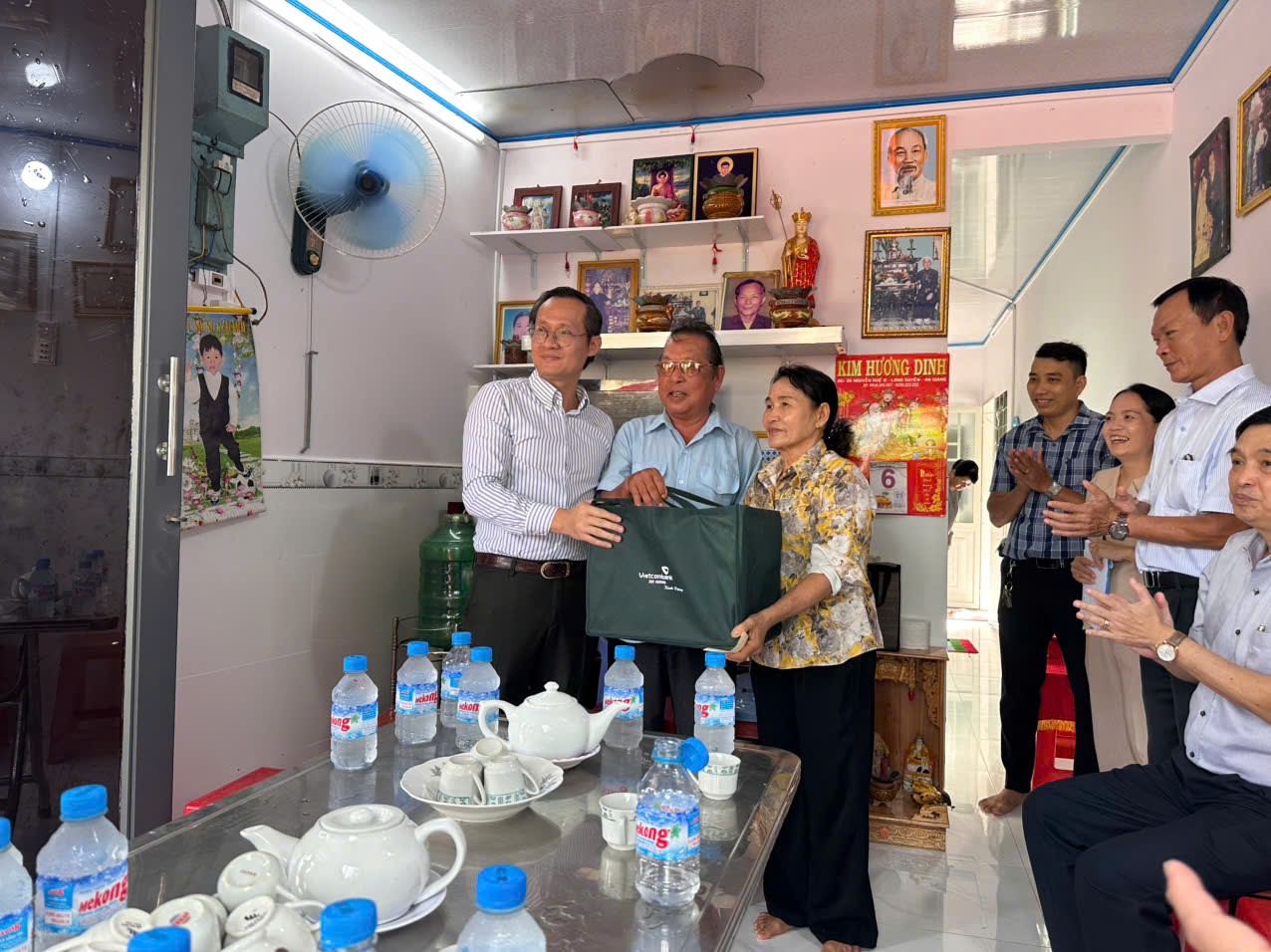 Ông Nguyễn Thành Trung – Phó Giám đốc Vietcombank An Giang (thứ 5 từ trái sang) chụp ảnh lưu niệm cùng ông Huỳnh Quốc Thái – UV BTV Tỉnh ủy, Bí thư Đảng ủy, Chủ tịch HĐND phường Long Xuyên và chính quyền địa phương, gia đình ông Lê Phát Quang