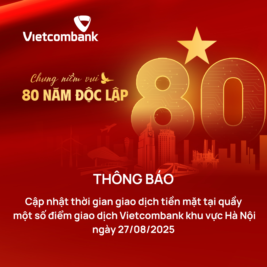 Căn cứ thông báo của Công an Thành phố Hà Nội về thời gian cấm triệt để các phương tiện lưu thông (trừ xe có phù hiệu bảo vệ, xe phục vụ lễ kỷ niệm) trong tháng 8/2025 tại Hà Nội để phân luồng giao thông phục vụ Lễ kỷ niệm 80 năm Cách mạng Tháng Tám và Quốc khánh 2/9, Vietcombank thông báo điều chỉnh thời gian giao dịch tiền mặt tại một số phòng giao dịch (PGD) như sau: