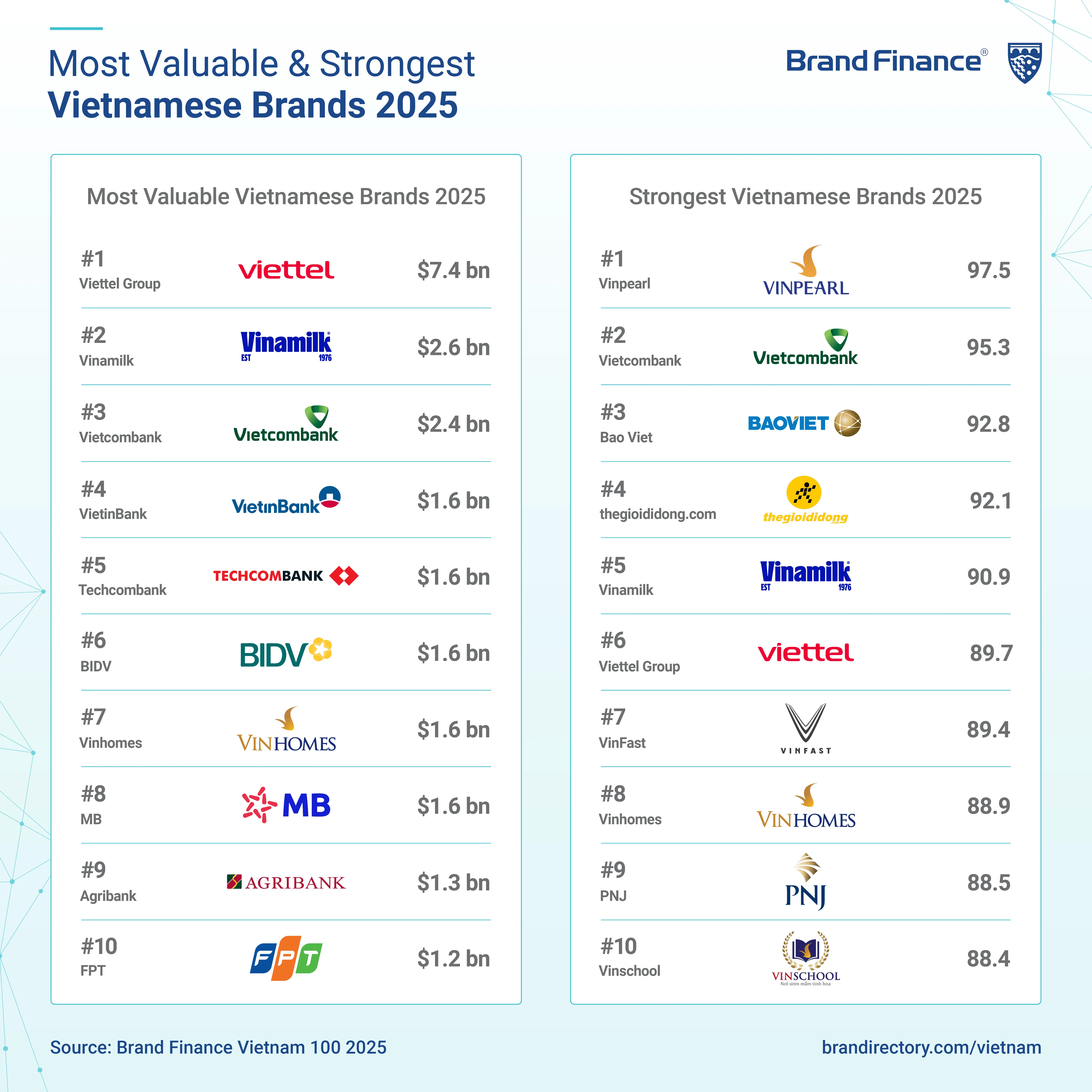Theo Báo cáo Vietnam 100 năm 2025 do Brand Finance - tổ chức định giá thương hiệu hàng đầu thế giới vừa công bố, Vietcombank tiếp tục giữ vững vị thế ngân hàng có giá trị thương hiệu lớn nhất Việt Nam, ghi nhận ba năm liên tiếp giữ vững vị thế này, đồng thời nằm trong Top 2 thương hiệu mạnh nhất cả nước.