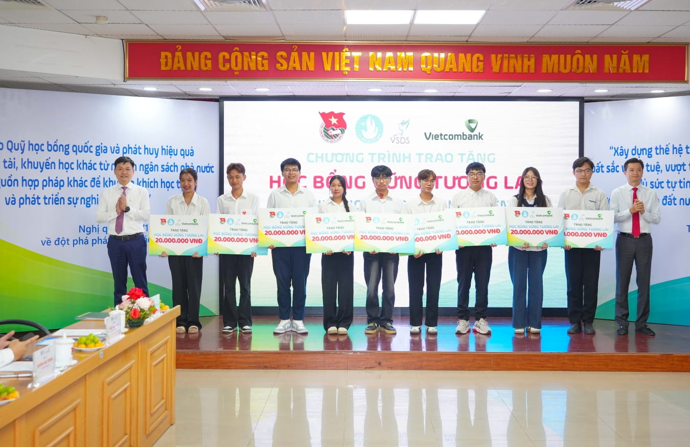Đ/c Dương Bảo Trung - Bí thư Đoàn Thanh niên Vietcombank (ngoài cùng, bên trái) và đ/c Nguyễn Đức Nguyên - Phó Trưởng Ban công tác Thanh thiếu nhi Trung ương Đoàn, Phó Chủ tịch Trung ương Hội Sinh viên Việt Nam (ngoài cùng, bên phải) trao các học bổng loại B của Quỹ Vững tương lai cho các bạn học sinh, sinh viên tiêu biểu