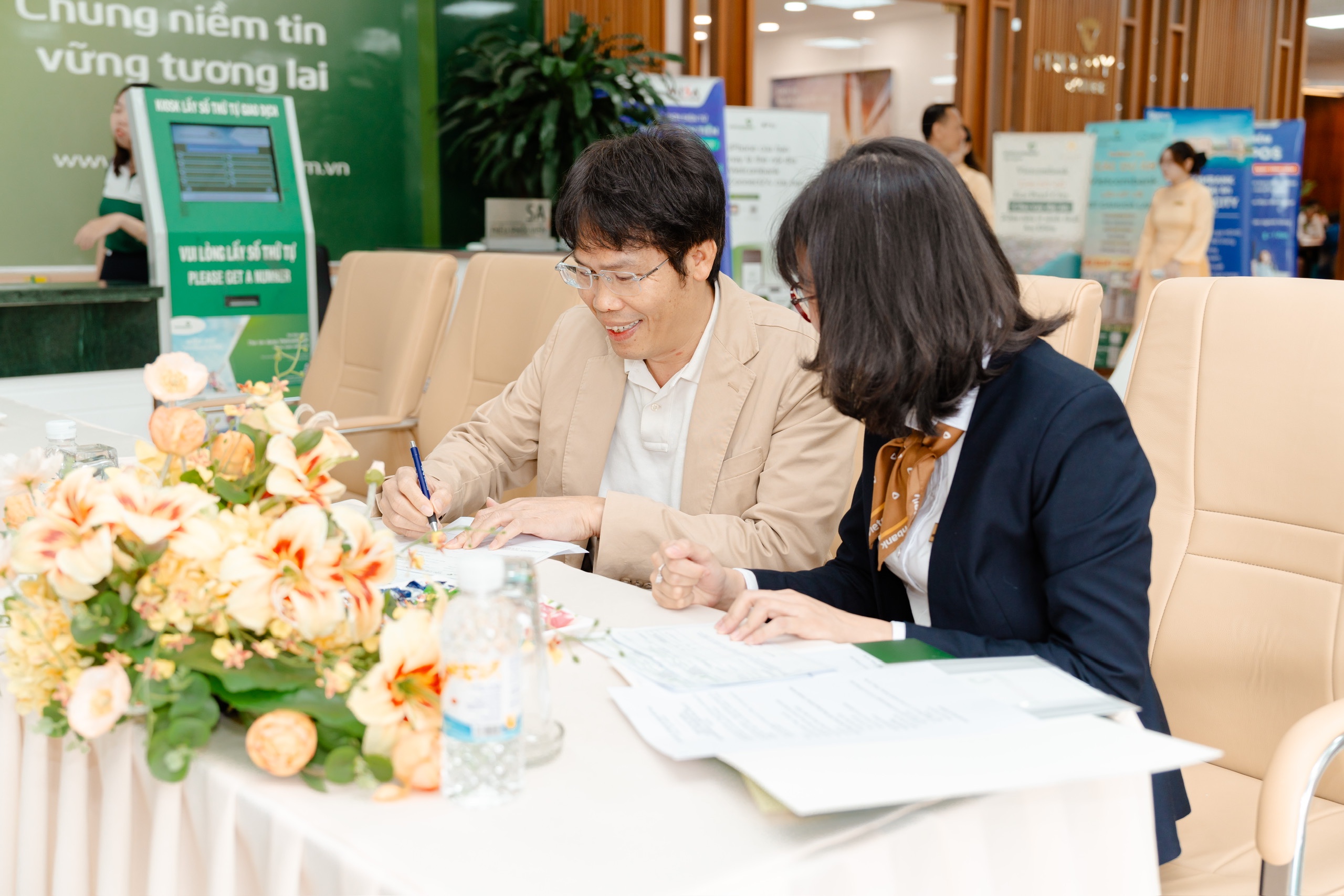 Cán bộ Vietcombank hướng dẫn anh Quang Nam hoàn thiện thủ tục liên quan sau khi nhận giải.