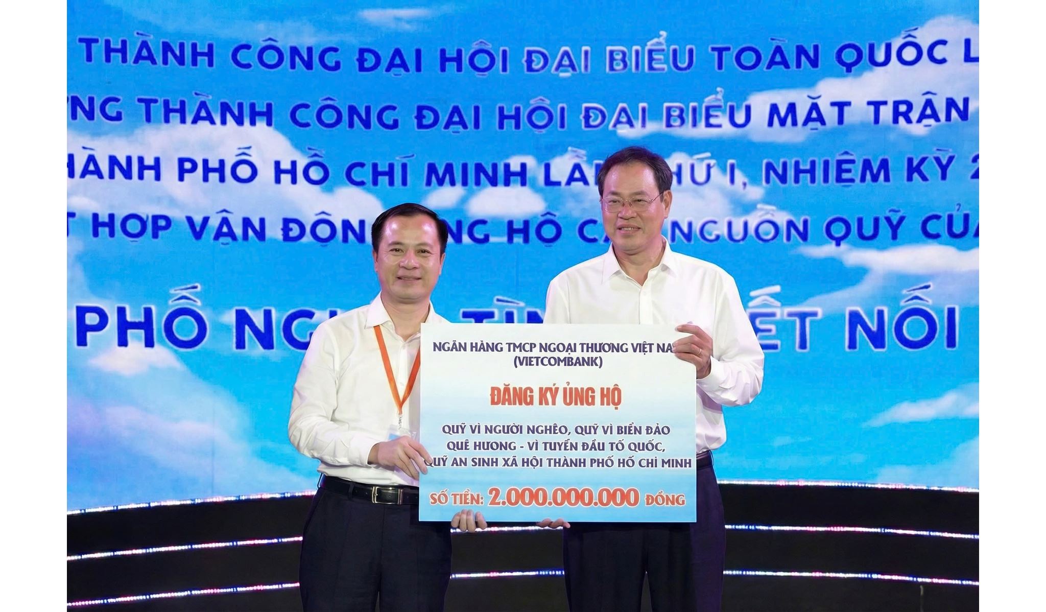 Tại TP. Hồ Chí Minh, Vietcombank tiếp tục khẳng định cam kết đồng hành cùng các hoạt động ý nghĩa của thành phố. Đồng chí Lê Hoàng Tùng - Phó Tổng Giám đốc Vietcombank đã đại diện ngân hàng trao tặng số tiền 2 tỷ đồng tài trợ cho Quỹ "Vì biển đảo quê hương - Vì tuyến đầu Tổ quốc" và Quỹ "Vì người nghèo" thành phố, góp phần chăm lo cho đời sống của nhân dân và các lực lượng đang ngày đêm canh giữ chủ quyền đất nước.