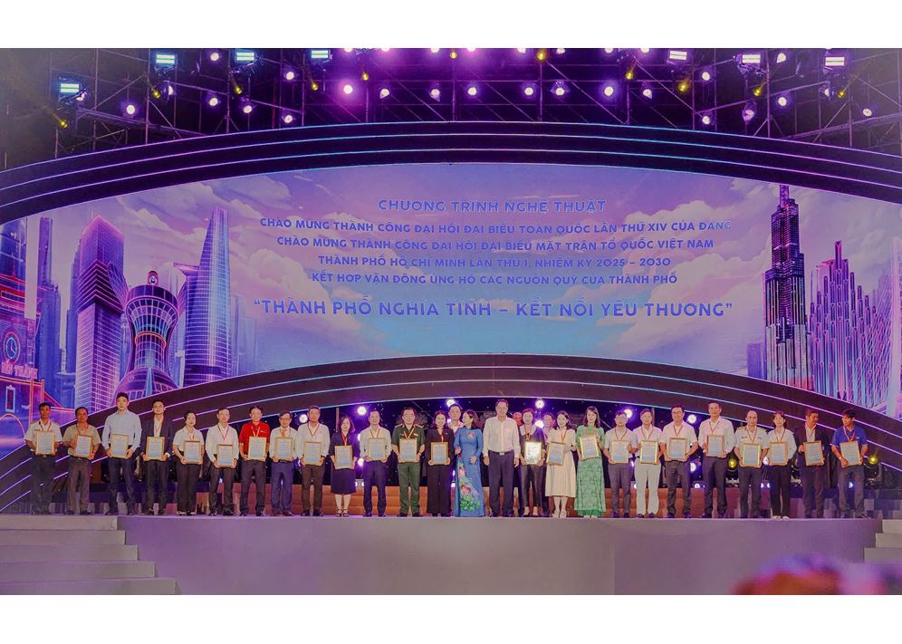 Đại diện Vietcombank, đồng chí Lê Hoàng Tùng - Phó Tổng Giám đốc (thứ 11 từ trái sang) nhận biểu trưng vinh danh của UBND TP.HCM đối với những đóng góp cho cho Quỹ "Vì biển đảo quê hương - Vì tuyến đầu Tổ quốc" và Quỹ "Vì người nghèo" của thành phố