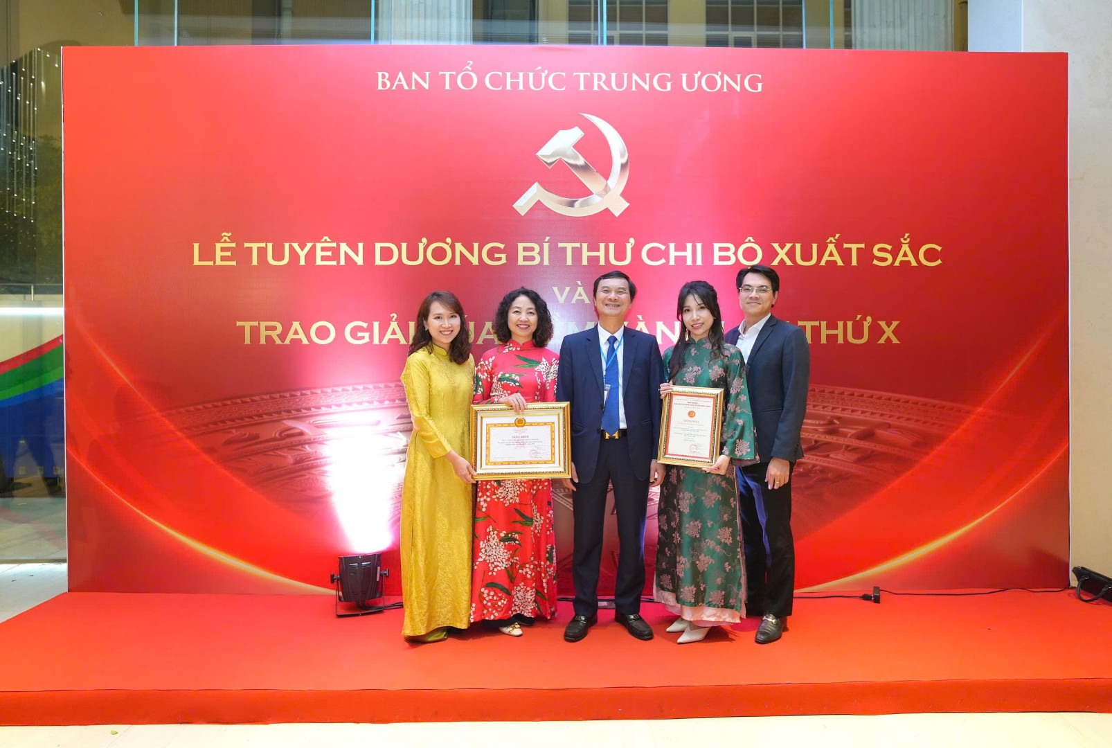 Đ/c Ngô Minh Tuấn - Trưởng Ban Xây dựng Đảng (Tạp chí Cộng sản), Phó Chủ tịch Hội đồng Sơ khảo, Trưởng Ban Thư ký Giải Búa Liềm Vàng lần thứ X chúc mừng và chụp ảnh lưu niệm với đại diện Nhóm tác giả đạt giải C, đ/c Phan Khánh Ngọc - Bí thư Chi bộ 31, Giám đốc Trung tâm hỗ trợ khách hàng (VCC) và đ/c Lê Tiến Hưng - Phó Bí thư Chi bộ 60, Phó Trưởng Ban Marketing và truyền thông (Tác phẩm “Tư duy hệ thống: Chìa khóa vàng trong hành trình kiến tạo vị thế dẫn dắt”)