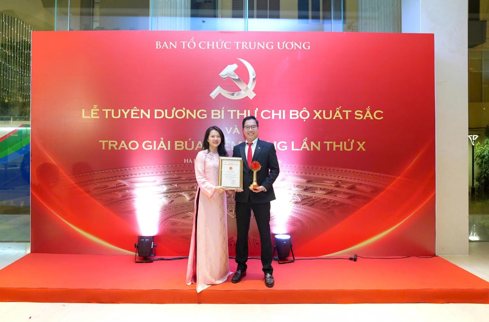Nhóm tác giả đạt giải Khuyến khích: đ/c Nguyễn Tiến Đạt - Bí thư Chi bộ 1, Chánh Văn phòng và đ/c Phạm Thị Khánh Hòa - Đảng viên Chi bộ 1 (Tác phẩm “Ngân hàng Vietcombank: vững vàng kiến tạo tầm vóc, tiến bước dưới lá cờ vinh quang của Đảng”)