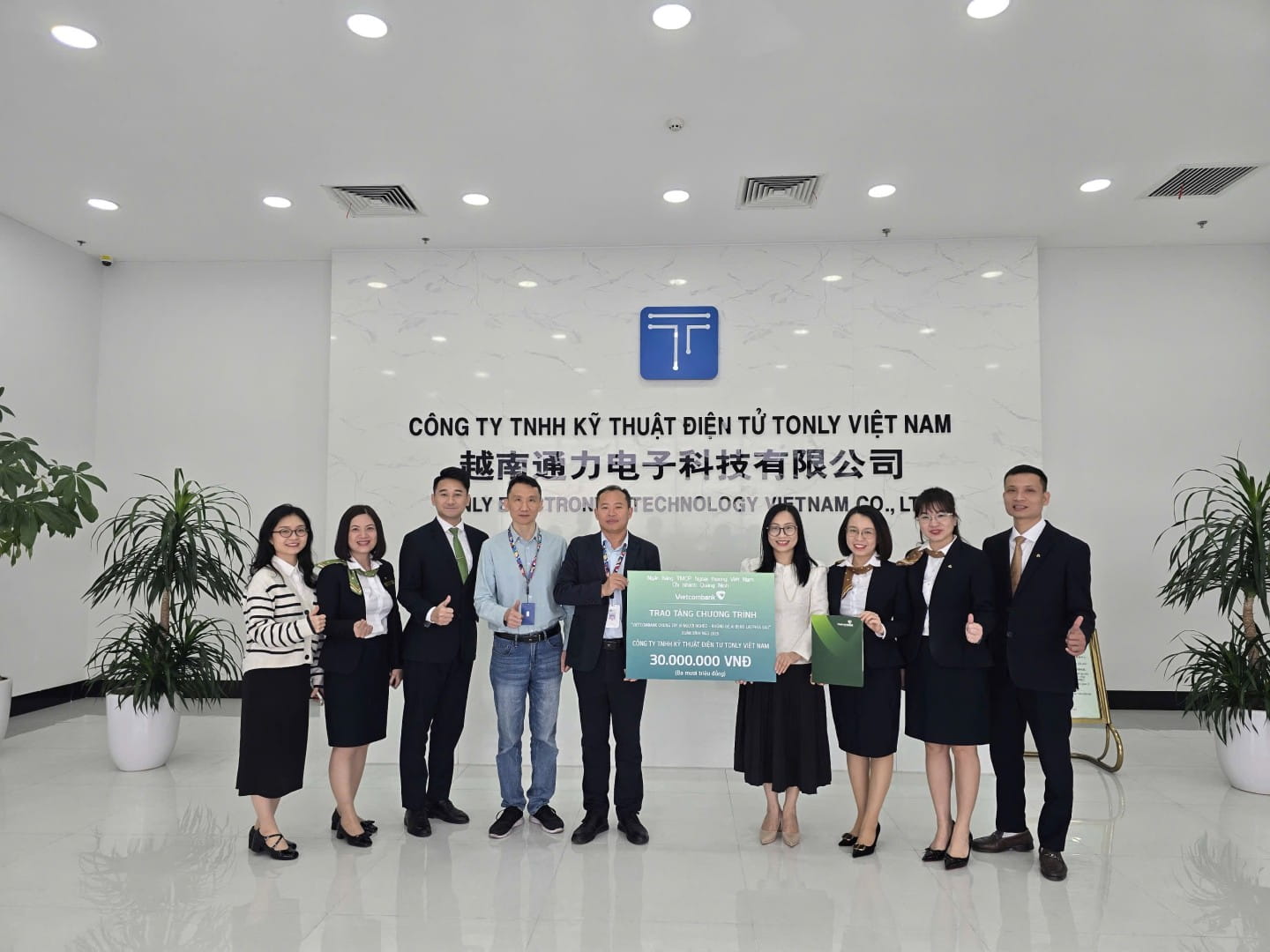 Đại diện Chi nhánh, đ/c Vũ Vân Anh - Phó giám đốc, Chủ tịch CĐSC Vietcombank Quảng Ninh (đứng thứ 4 từ phải sang) tặng quà cho công nhân lao động Công ty TNHH Kỹ thuật Điện tử Tonly Việt Nam