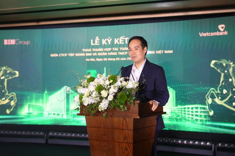 Đại diện BIM Group phát biểu tại sự kiện, ông Đoàn Quốc Huy - Chủ tịch Hội đồng quản trị kiêm Tổng Giám đốc BIM Group chia sẻ: “Vietcombank luôn là đối tác số 1 trong quá trình xây dựng và phát triển của BIM Group trong nhiều năm qua. Sự hợp tác toàn diện ngày hôm nay góp phần thể hiện sự gắn bó ngày càng sâu sắc và toàn diện của Vietcombank và BIM Group, góp phần đem lại lợi ích cho đất nước và hiệu quả cho cả hai bên”.