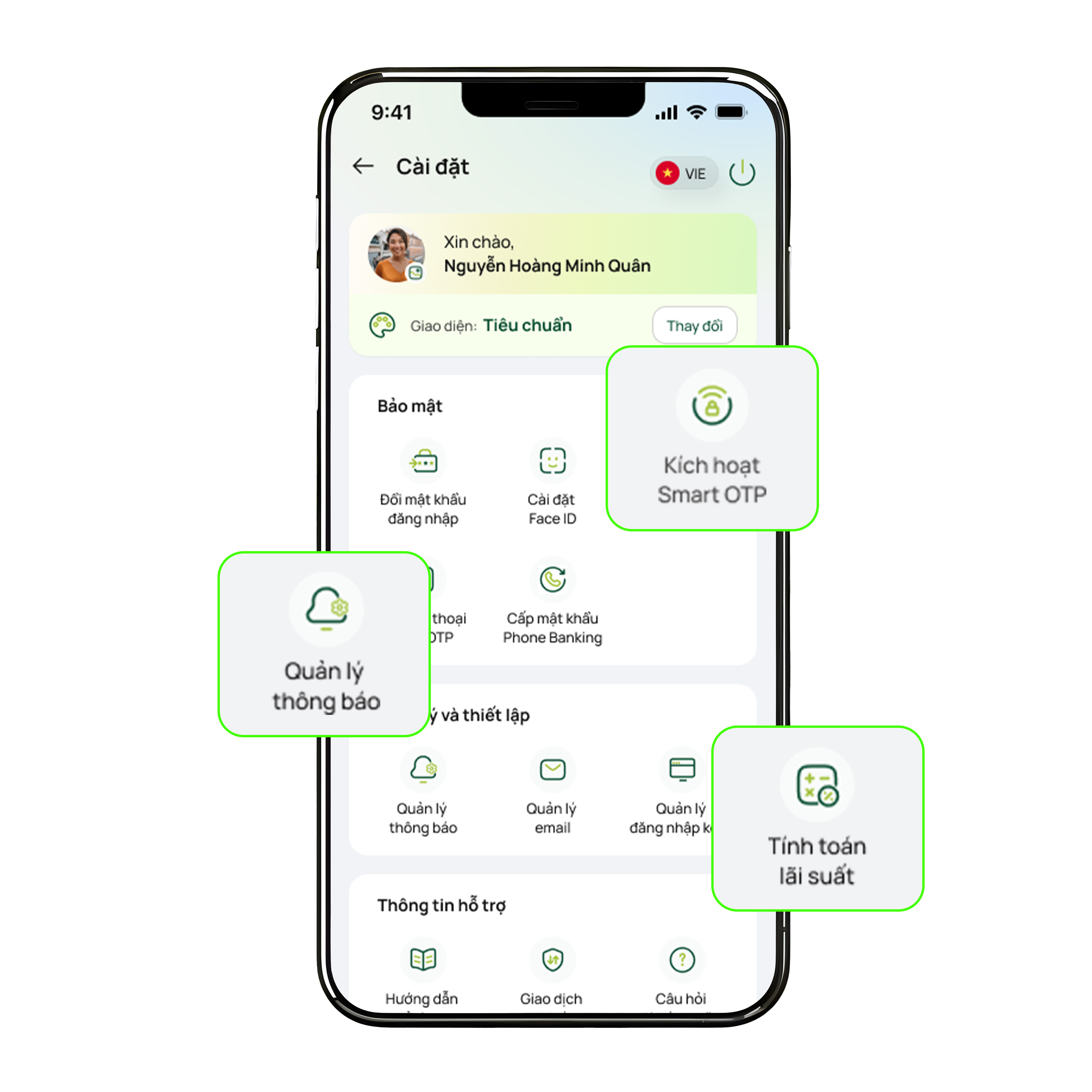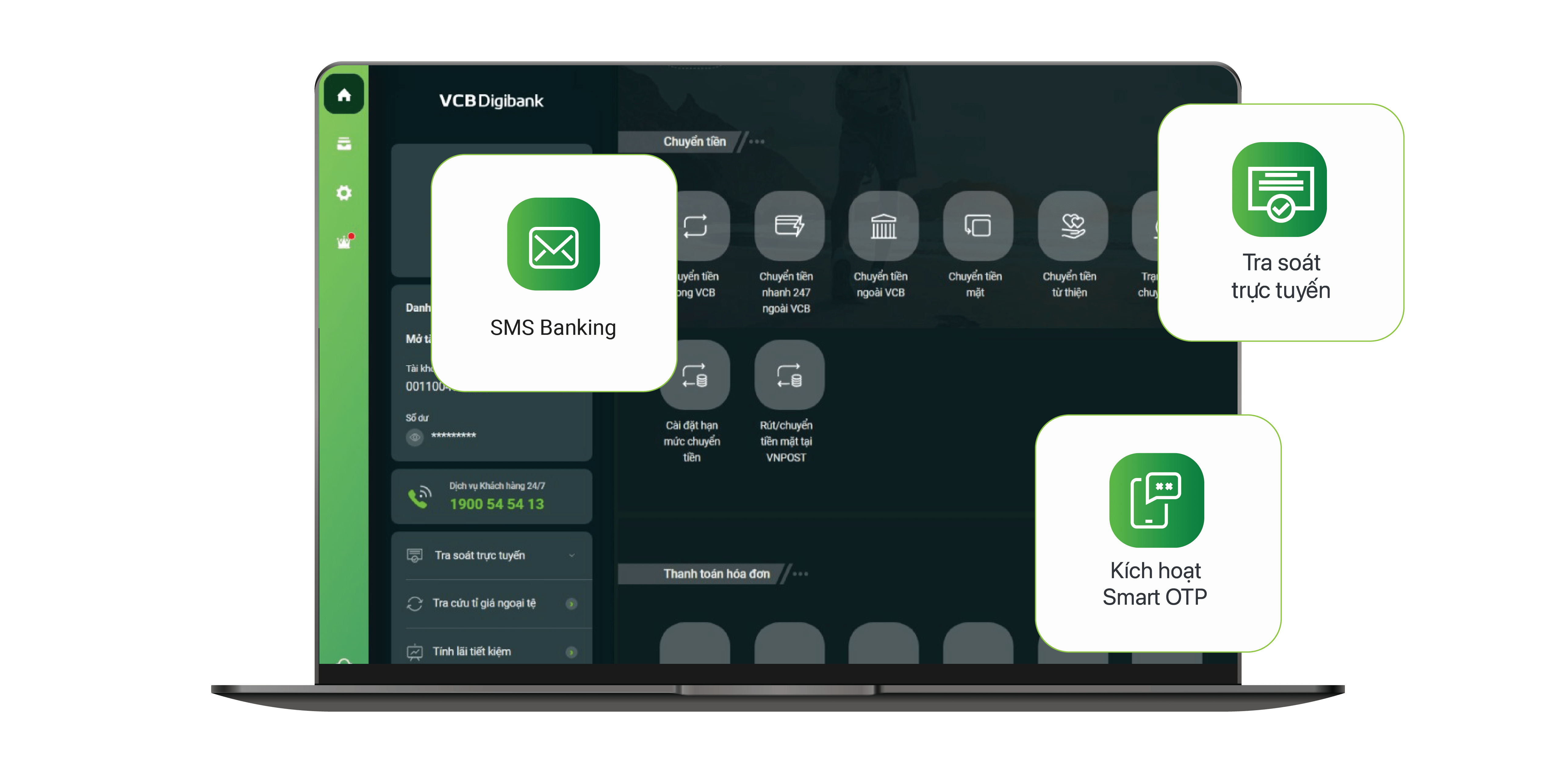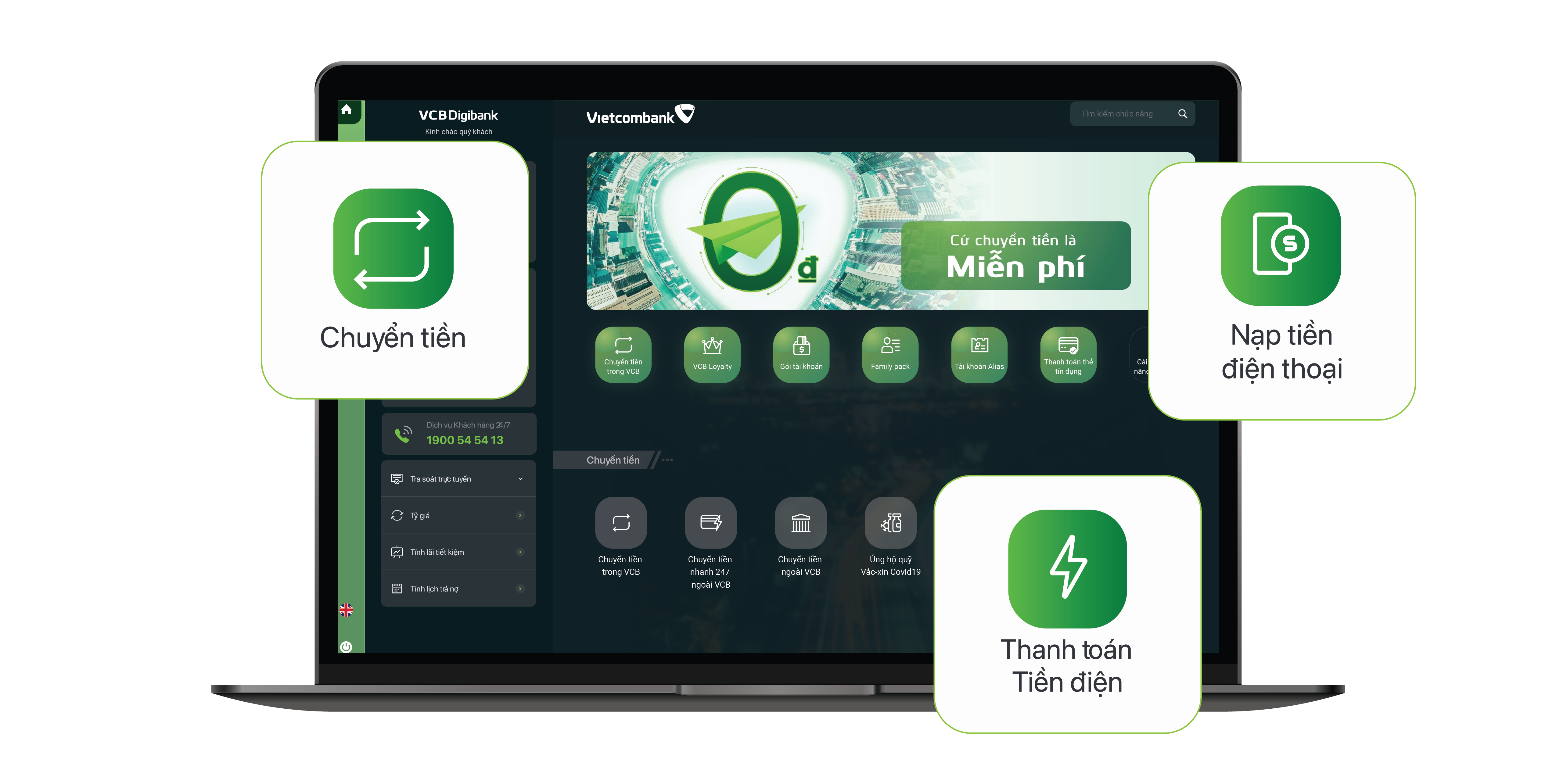 Transfer money within Vietcombank and other banking institutions, make payments for utilities, e-wallet top-up, and open savings