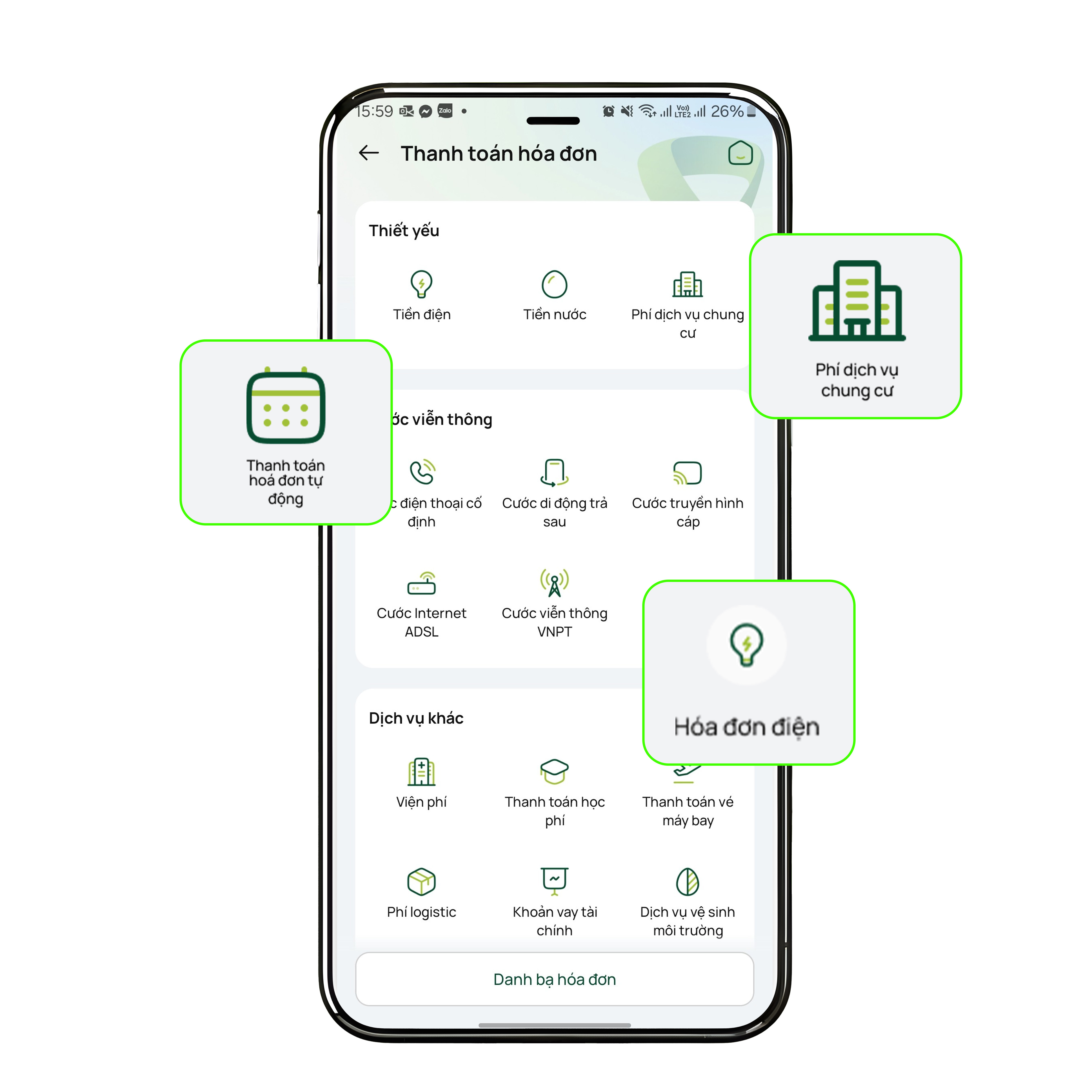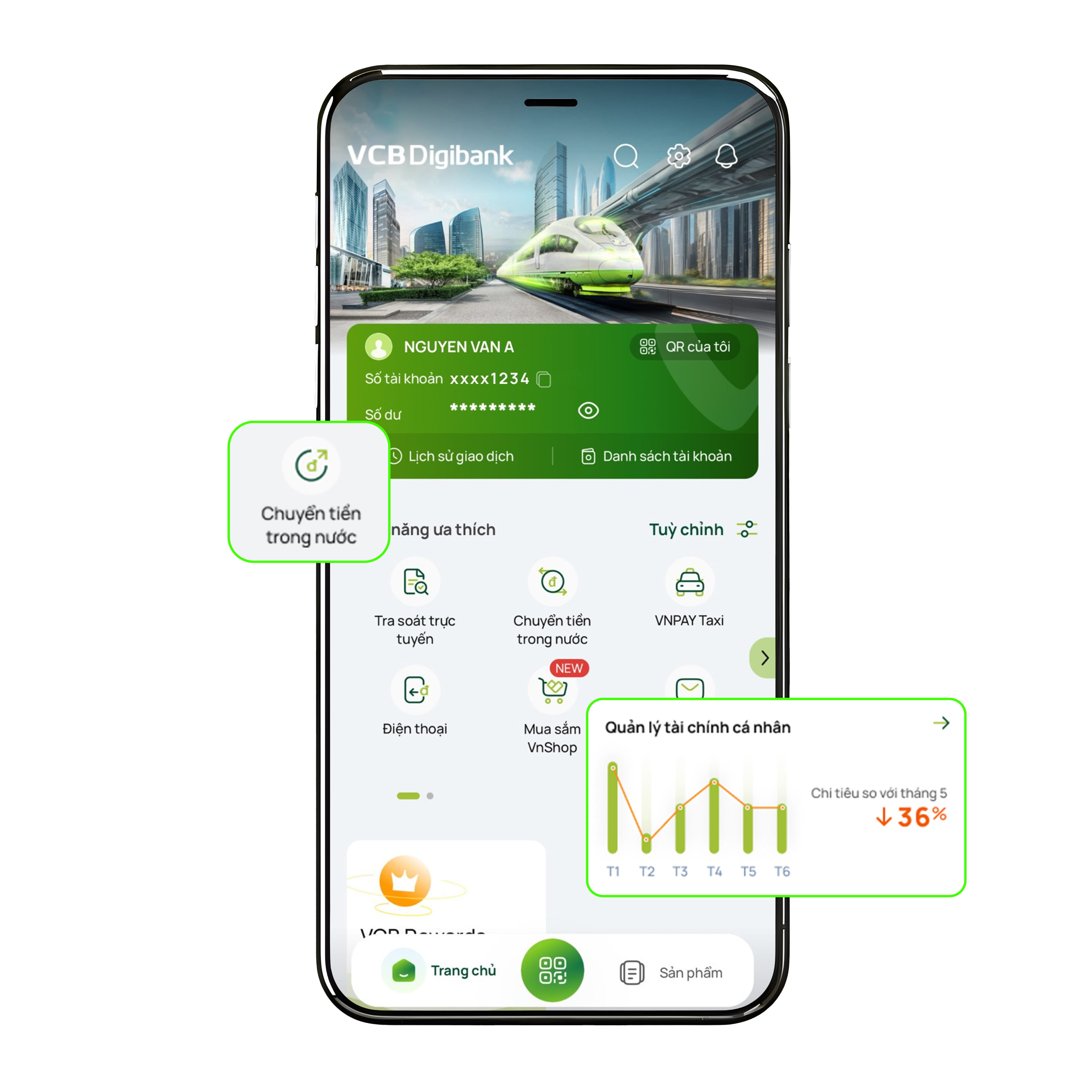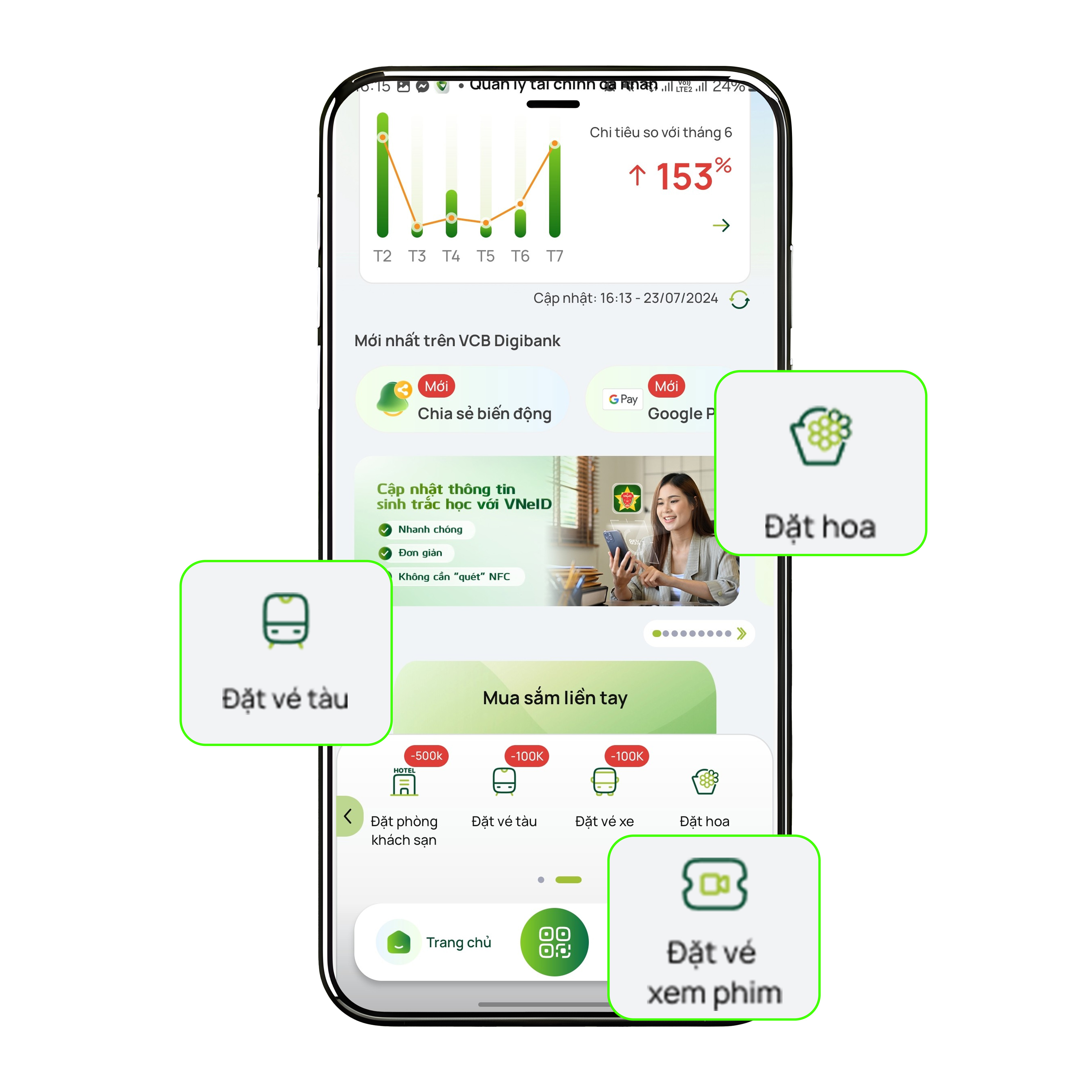 Transfer money within Vietcombank and other banking institutions, make payments for utilities, e-wallet top-up, and open savings