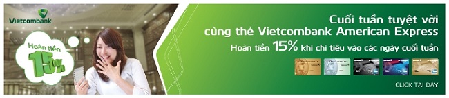 Ngân hàng TMCP Ngoại thương Việt Nam (Vietcombank) xin trân trọng gửi đến Quý khách hàng chương trình khuyến mãi “Cuối tuần tuyệt vời cùng thẻ Vietcombank Amerian Express” với ưu đãi HOÀN TIỀN 15% khi chi tiêu bằng thẻ tín dụng Vietcombank American Express vào các ngày cuối tuần tại hàng loạt các điểm chấp nhận thanh toán thẻ American Express của Vietcombank.