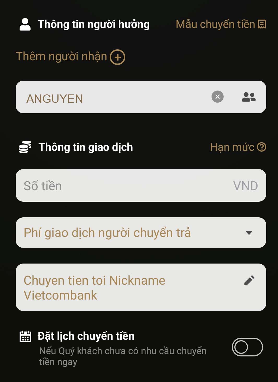 Tương tự, nếu có nhu cầu chuyển tiền từ ngân hàng khác tới NICKNAME tài khoản Vietcombank, tại mục SỐ TÀI KHOẢN CỦA NGƯỜI THỤ HƯỞNG, khách hàng chỉ cần nhập NICKNAME tài khoản Vietcombank, hệ thống sẽ tự động xác định tài khoản và hiển thị TÊN NGƯỜI THỤ HƯỞNG để khách hàng kiểm tra thông tin trước khi chuyển tiền.
