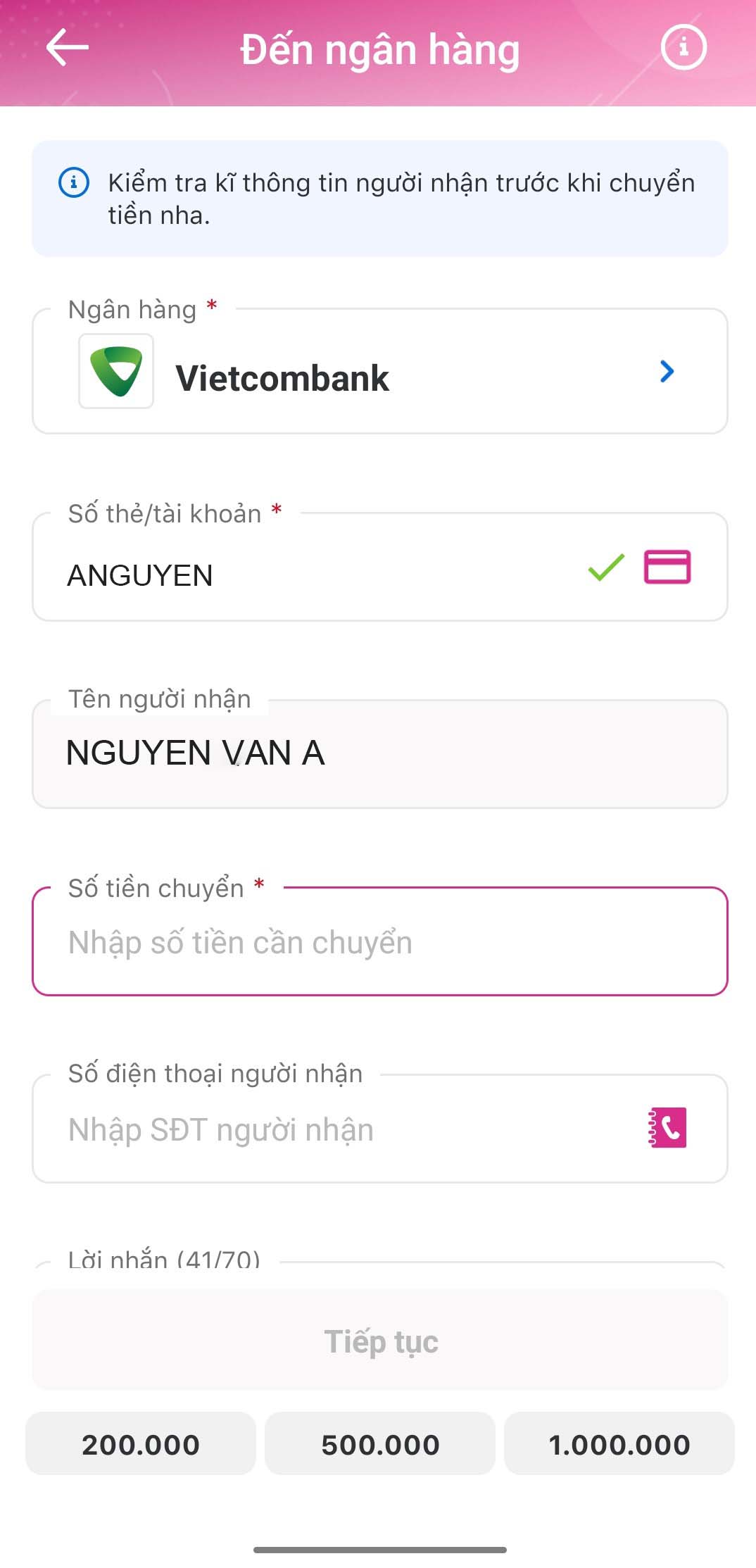 Cụ thể, tại mục chuyển tiền trên Ví điện tử, sau khi chọn Ngân hàng Vietcombank, khách hàng chỉ cần nhập NICKNAME vào ô SỐ THẺ/TÀI KHOẢN (tùy theo từng loại ví điện tử), hệ thống sẽ tự động xác định tài khoản và hiển thị TÊN NGƯỜI THỤ HƯỞNG để khách hàng kiểm tra thông tin trước khi chuyển tiền.