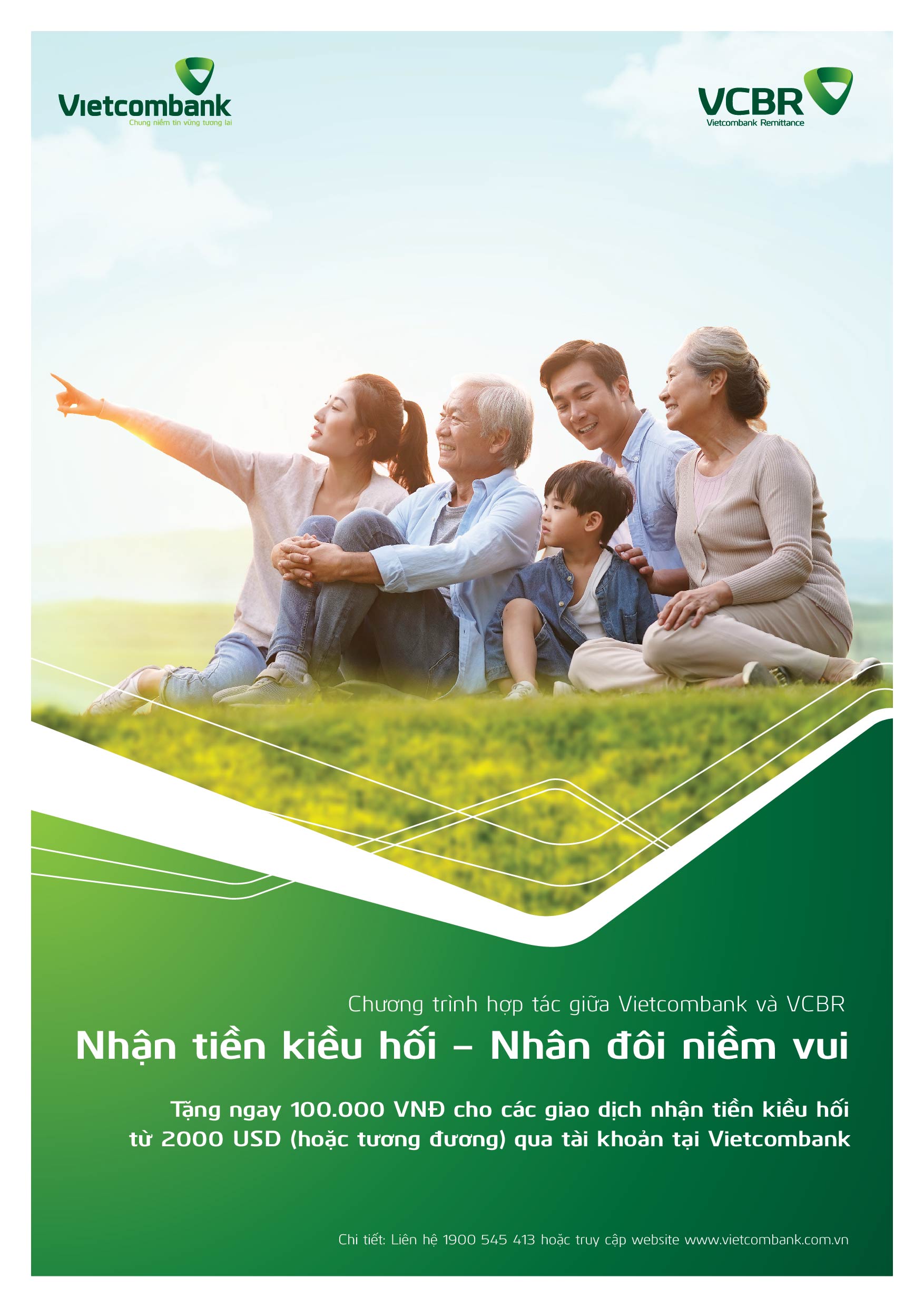 Với mục đích tri ân khách hàng đã gắn bó với Vietcombank, từ ngày 01/10/2020, Vietcombank phối hợp với VCBR triển khai chương trình khuyến mại “Nhận tiền kiều hối – Nhân đôi niềm vui”. Theo đó, Vietcombank dành tặng 100.000 VNĐ cho các giao dịch chuyển – nhận tiền kiều hối có giá trị từ 2.000 USD trở lên (hoặc tương đương), trong đó, người chuyển ở nước ngoài thực hiện chuyển tiền về Việt Nam qua mạng lưới đối tác của VCBR và người nhận trong nước nhận tiền qua tài khoản mở tại Vietcombank.