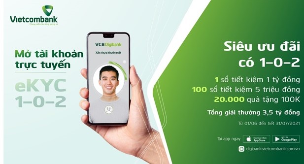 Cùng với việc ra mắt dịch vụ, từ ngày 01/06/2021 đến hết ngày 31/07/2021, Vietcombank triển khai chương trình khuyến mại “Siêu ưu đãi có 1-0-2” với hàng chục nghìn giải thưởng hấp dẫn cho khách hàng mở tài khoản trực tuyến:
