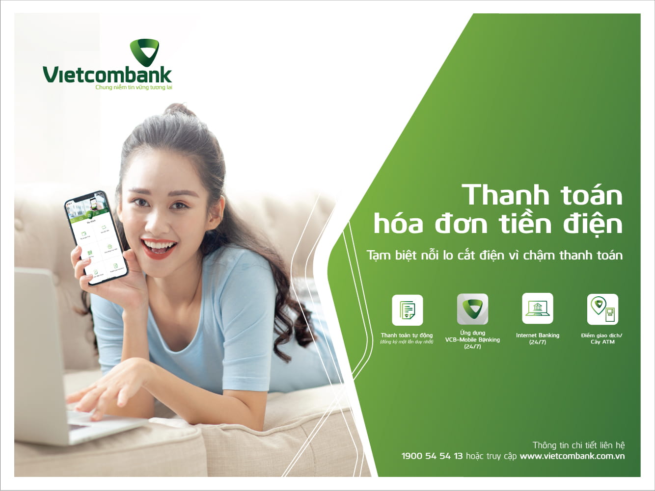 - Đặc biệt, bạn có thể lựa chọn hình thức thanh toán tự động với chỉ một lần đăng ký duy nhất (tại điểm giao dịch, Internet Banking hay Mobile Banking), hằng tháng, Vietcombank sẽ tự động thanh toán hóa đơn theo thông báo của Công ty điện lực.