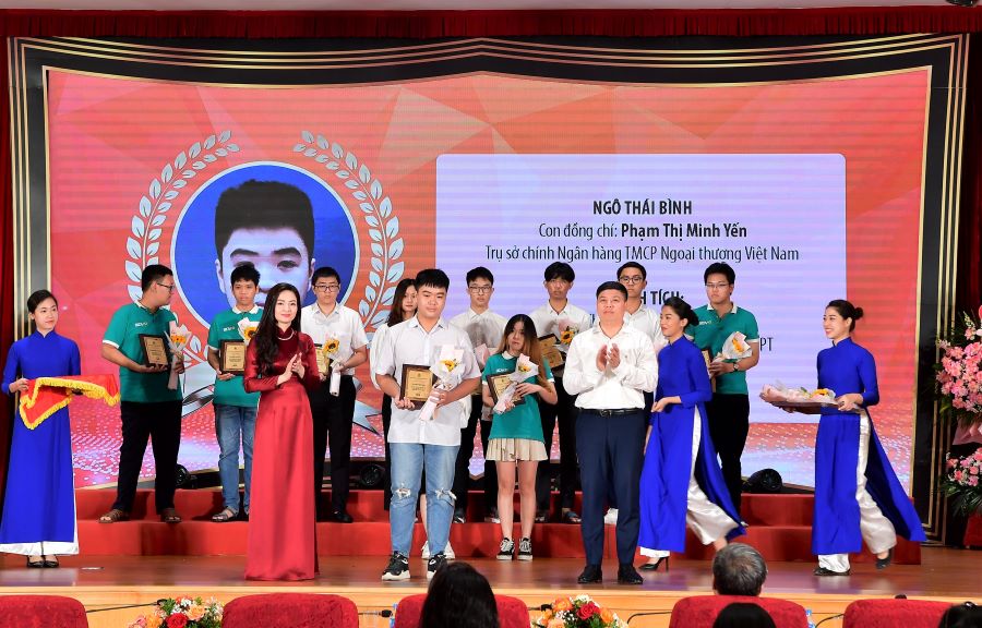 Bà Nguyễn Khánh Chi - Phó Chủ tịch Công đoàn ngành Ngân hàng và ông Hồng Quang - Thành viên HĐQT kiêm Giám đốc Khối Nhân sự, Chủ tịch Công đoàn Vietcombank trao thưởng và tặng hoa cho học sinh Ngô Thái Bình