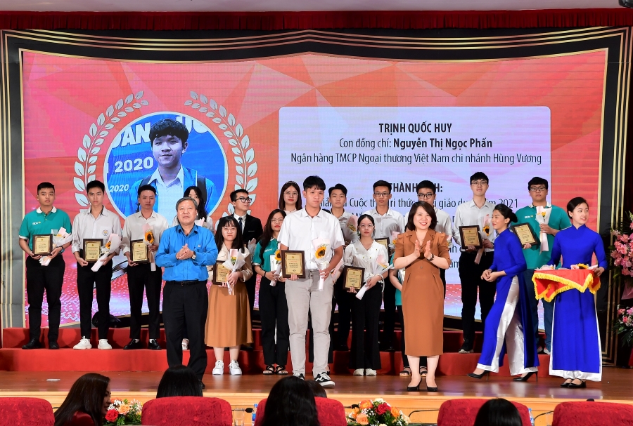 Ông Nguyễn Văn Tân - Phó Chủ tịch thường trực Công đoàn ngành Ngân hàng và bà Đặng Mai Phương - Ủy viên BTV Công đoàn NHVN, Chủ tịch Công đoàn Ngân hàng Hợp tác trao thưởng và tặng hoa cho học sinh Trịnh Quốc Huy