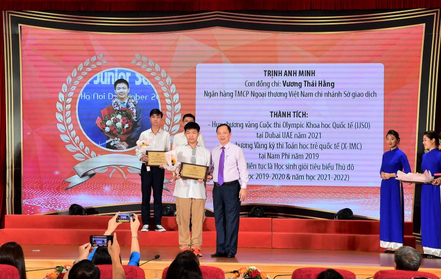 | 10 | Trịnh Anh Minh - lớp 10 Lý, Trường PTTH Chuyên Hà Nội - Amsterdam | - Huy chương vàng Kỳ thi Toán học quốc tế IMC (International Mathematics Competition) tại Nam Phi năm 2019 (SA-IMC 2019) - Huy chương vàng Cuộc thi Olympic Khoa học Quốc tế 2021 (IJSO - International Junior Science Olympiad 2021) - Huy chương đồng cuộc thi Olympic Khoa học trẻ Quốc tế Hàn Quốc năm học 2021 - 2022 (KIYO - Korean International Youth Olympiad 2021) - Học sinh giỏi tiêu biểu thủ đô năm học 2019 - 2020 & năm học 2021 - 2022 | Vương Thái Hằng - Phó Giám đốc Vietcombank Sở giao dịch |