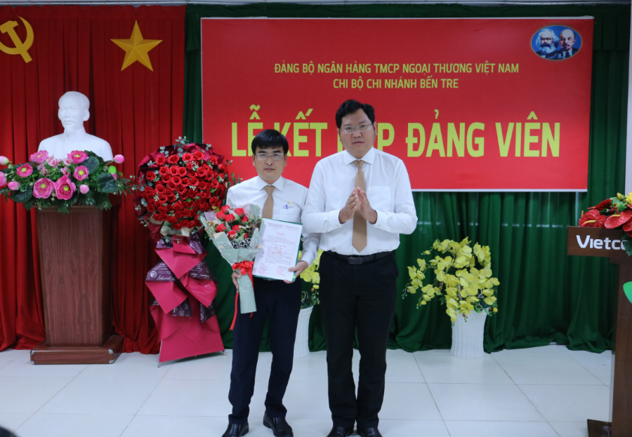 Ngày 12/10/2022, tại trụ sở chi nhánh, Chi bộ cơ sở Vietcombank Bến Tre đã tổ chức Lễ kết nạp đảng viên cho quần chúng Nguyễn Tấn Tú - Phó trưởng phòng Khách hàng và quần chúng Nguyễn Bảo Thịnh - Phó trưởng phòng Quản lý nợ.