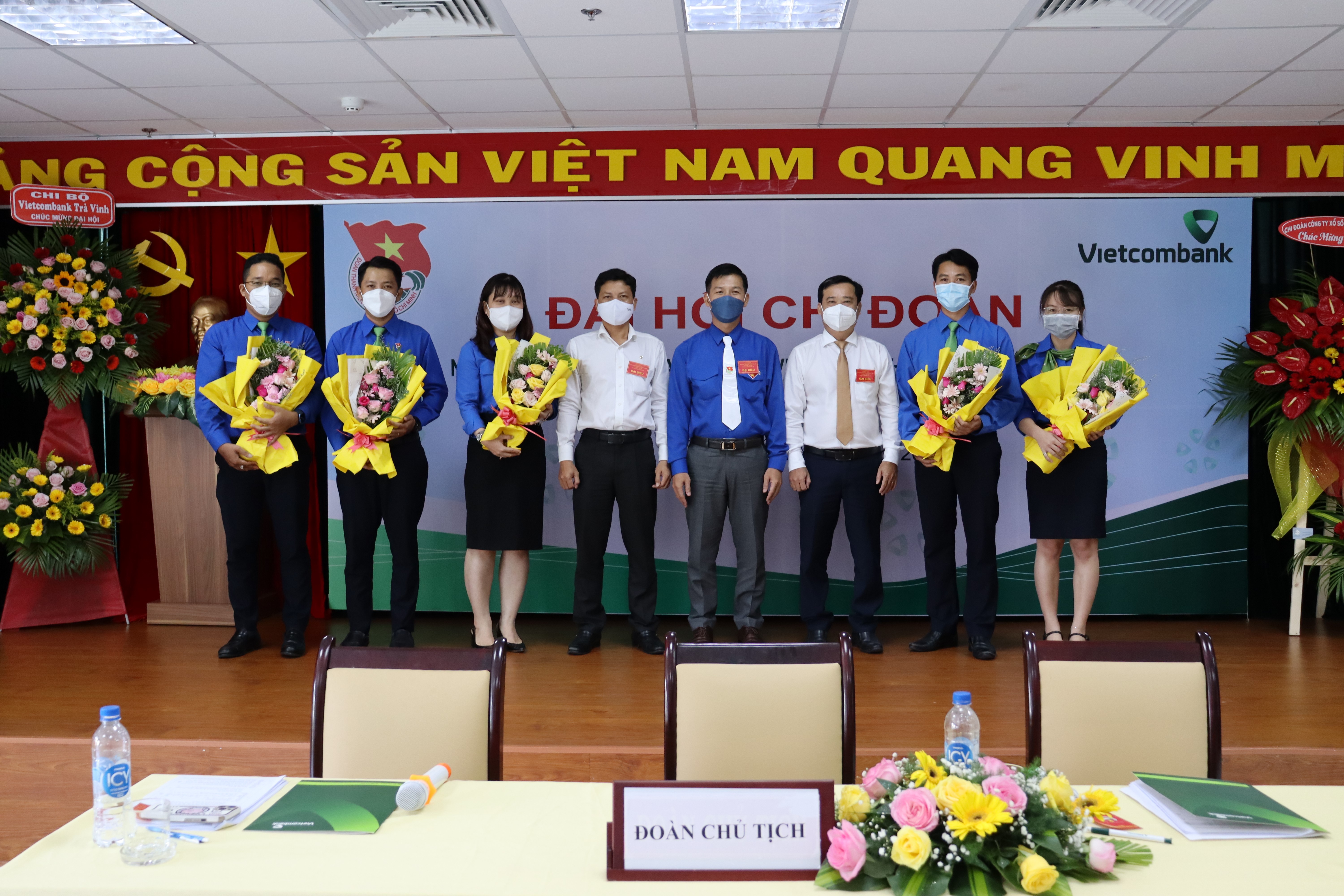 Đ/c Dương Quốc Toàn - Uỷ viên Ban thường vụ tỉnh Đoàn, Phó Bí thư Đoàn khối các cơ quan và doanh nghiệp tỉnh Trà Vinh (thứ 5 từ trái sang); Đ/c Trang Văn Út - Phó bí thư Chi bộ, Phó Giám đốc Chi nhánh (thứ 3 từ phải sang); Đ/c Đỗ Thành Lý - Chủ tịch Công đoàn, Phó Giám đốc chi nhánh (thứ 4 từ trái sang) tặng hoa chúc mừng đ/c Cao Nguyễn Thúy Vy (thứ 3 từ trái sang) - Bí thư Chi đoàn Vietcombank Trà Vinh và các đ/c ủy viên BCH Chi đoàn Vietcombank Trà Vinh khóa V, nhiệm kỳ 2022 – 2024