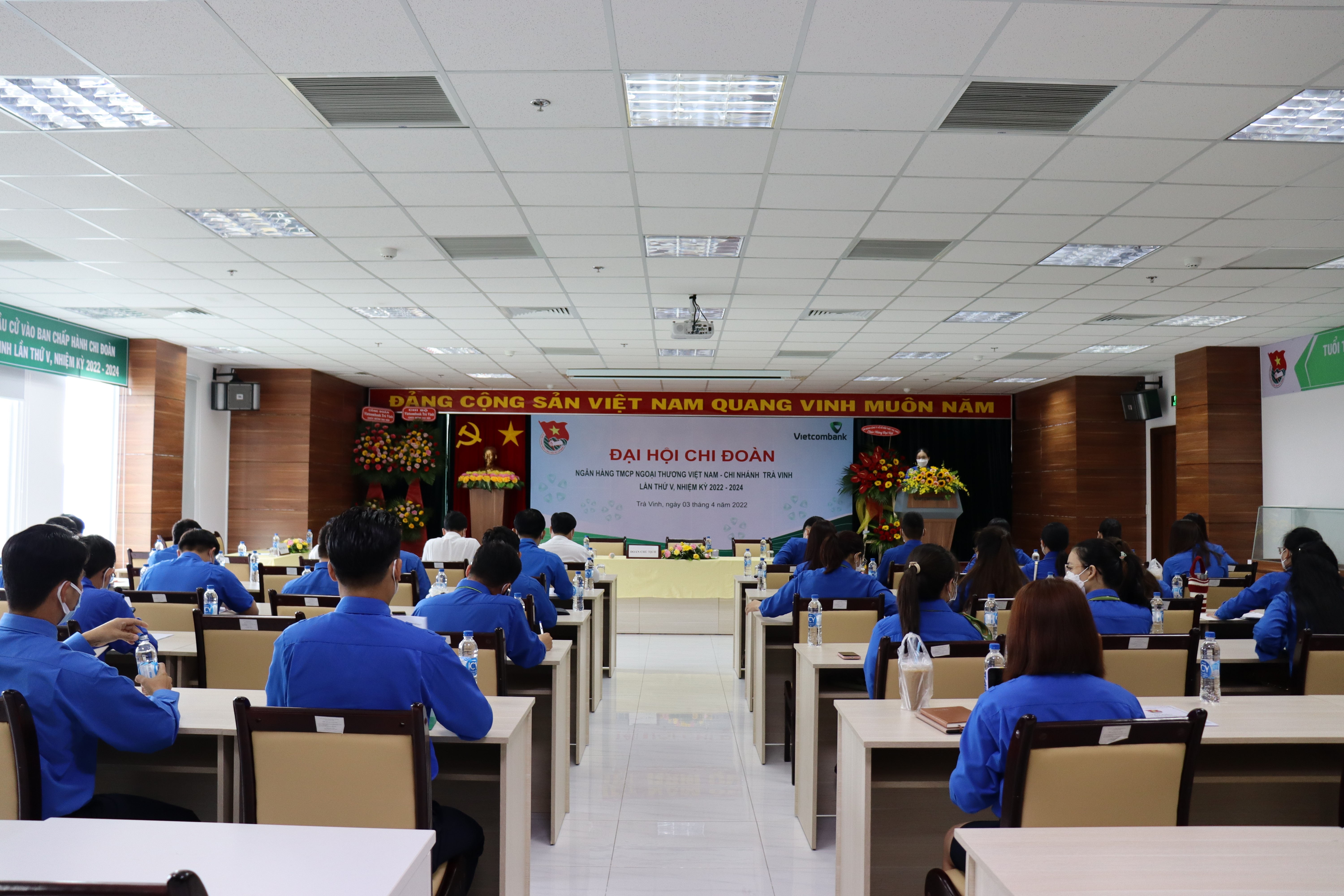 Đ/c Dương Quốc Toàn - Uỷ viên Ban thường vụ tỉnh Đoàn, Phó Bí thư Đoàn khối các cơ quan và doanh nghiệp tỉnh Trà Vinh (ngoài cùng bên trái ) và đ/c Đỗ Thành Lý – Chủ tịch Công đoàn, Phó Giám đốc chi nhánh (ngoài cùng bên phải) tặng hoa chúc mừng các đại biểu chính thức dự Đại hội đại biểu TNCS Hồ Chí Minh Khối các cơ quan và doanh nghiệp tỉnh Trà Vinh lần thứ VII nhiệm kỳ 2022 - 2027