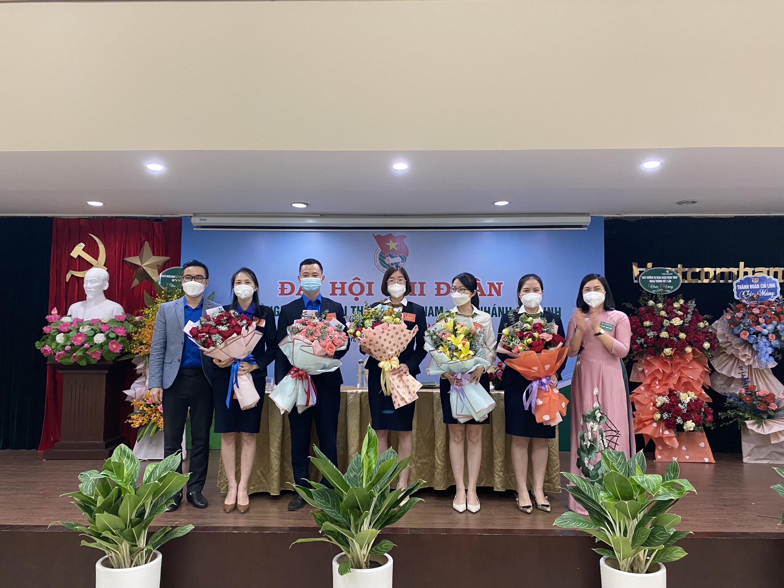 Đ/c Bùi Thị Nghĩa - Bí thư Chi bộ, Giám đốc Vietcombank Chí Linh và đồng chí Nguyễn Trung Hải - Ủy viên BTV Đoàn thanh niên Vietcombank tặng hoa BCH nhiệm kỳ mới 2022-2024