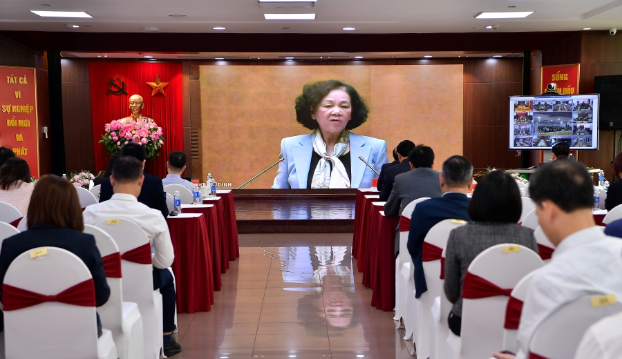 Đ/c Trương Thị Mai - Ủy viên Bộ Chính trị, Bí thư Trung ương Đảng, Trưởng ban Tổ chức Trung ương truyền đạt chuyên đề tại Hội nghị