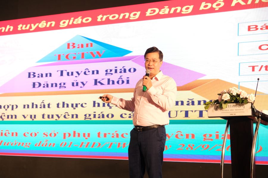 Đ/c Nguyễn Trung Hiếu – Ủy viên BTV Đảng ủy, Trưởng Ban Tuyên giáo, Đảng ủy Khối DNTW truyền đạt chuyên đề về công tác tuyên giáo tại Hội nghị