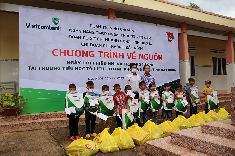 Tại ngày hội thiếu nhi, Đoàn Thanh Niên Vietcombank Đông Bình Dương và Đắk Nông tổ chức thăm hỏi, trao tặng 66 phần học bổng cho các bé thiếu nhi có hoàn cảnh khó khăn, tổ chức các trò chơi và tặng bánh kẹo với tổng giá trị 30 triệu đồng.