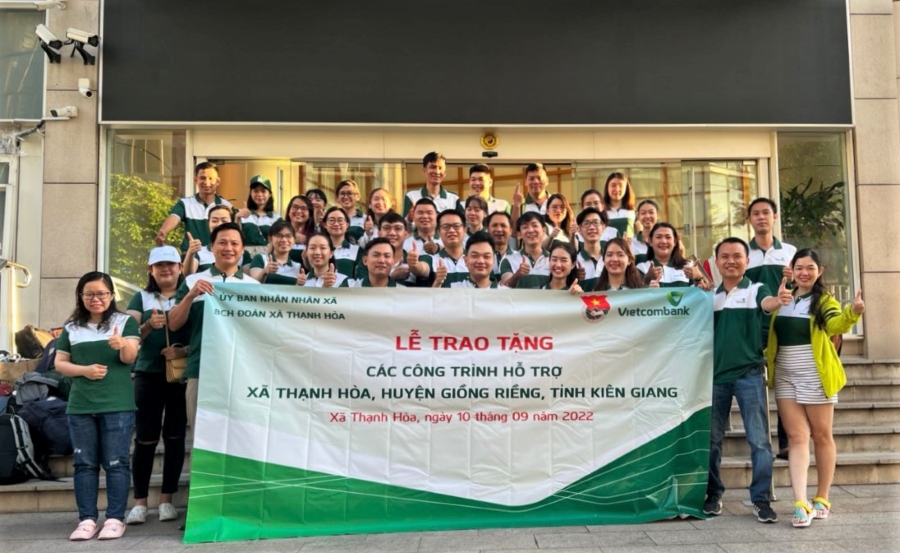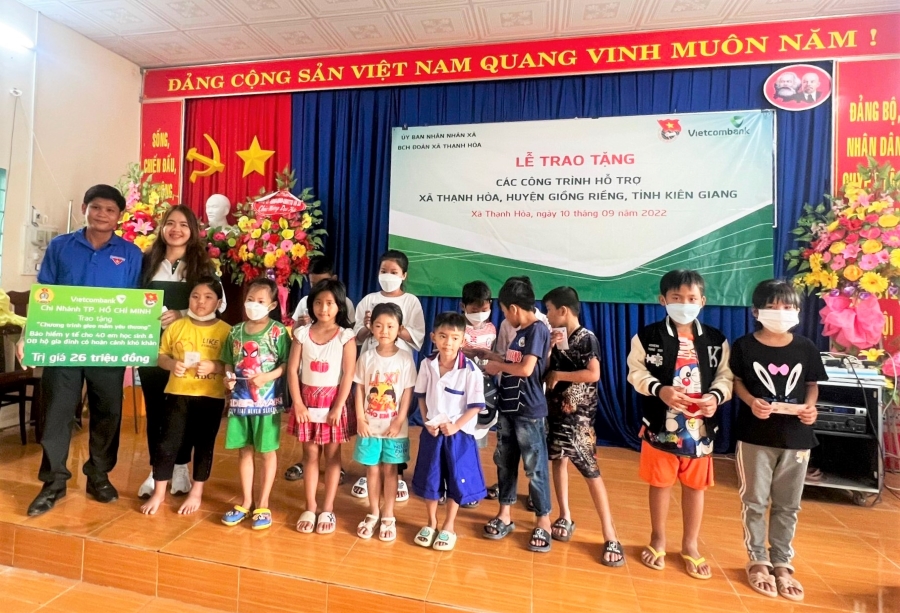 Bên cạnh đó, ĐTN cơ sở Vietcombank Hồ Chí Minh cũng đã trao tặng địa phương các công trình ASXH thiết thực như: 01 “ngôi nhà yêu thương” cho hộ gia đình khó khăn nhất địa phương trị giá 50 triệu đồng; 48 thẻ BHYT cho học sinh nghèo và hộ gia đình khó khăn trị giá 26 triệu đồng; 02 khu vui chơi thiếu nhi trị giá 30 triệu đồng và 20 hố rác gia đình trị giá 10 triệu đồng. Tổng giá trị trao tặng ASXH cho xã Thạnh Hòa là 161 triệu đồng, số tiền này đã được CBNV Chi nhánh tự nguyện đóng góp trên tinh thần sẻ chia vì cộng đồng.