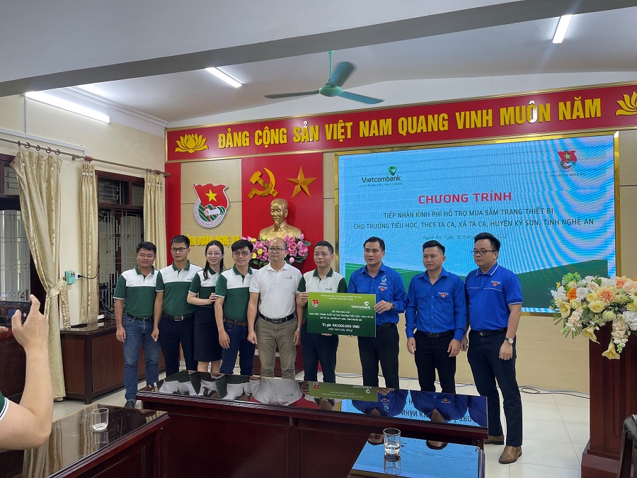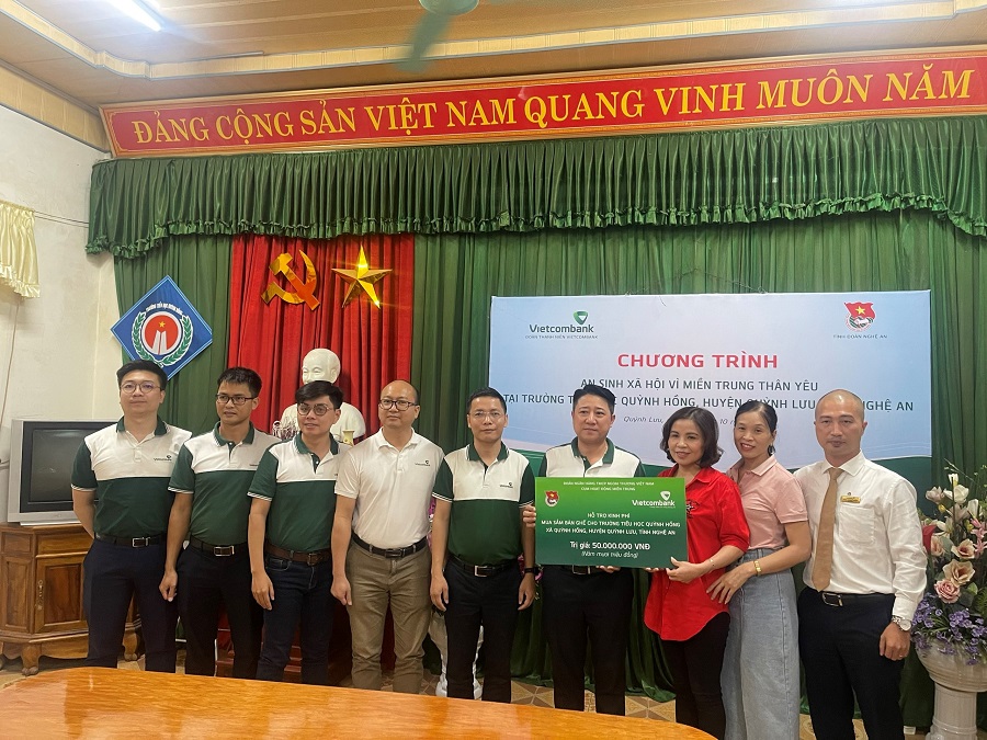Cụm hoạt động KV Miền Trung - Đoàn Thanh niên Vietcombank trao biểu trưng hỗ trợ kinh phí cho Ban Giám hiệu trường Tiểu học Quỳnh Hồng