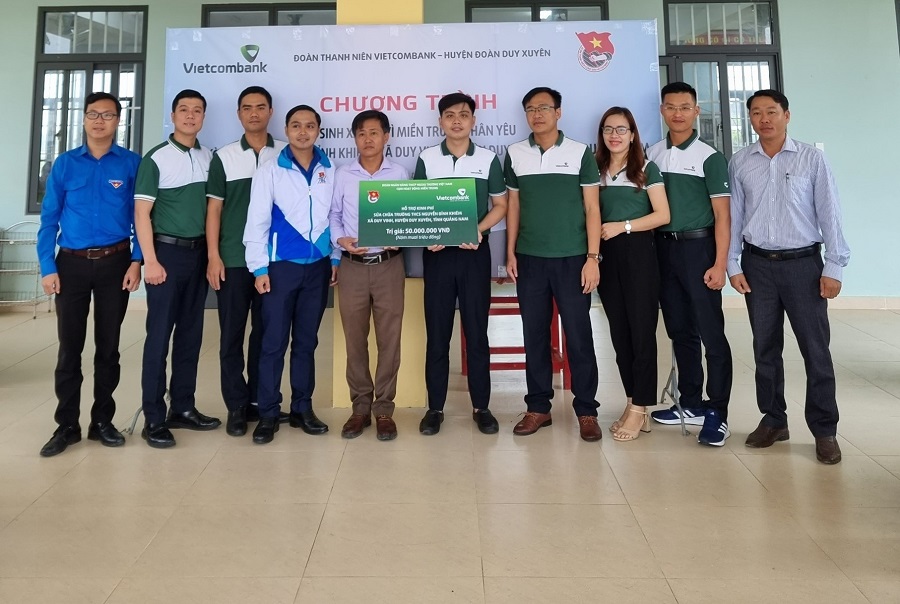 Cụm hoạt động KV Miền Trung - Đoàn Thanh niên Vietcombank trao biểu trưng hỗ trợ kinh phí cho Ban Giám hiệu trường THCS Nguyễn Bỉnh Khiêm với sự tham gia của các cơ quan: Tỉnh đoàn Quảng Nam, Huyện đoàn Duy Xuyên và UBND xã Duy Vinh