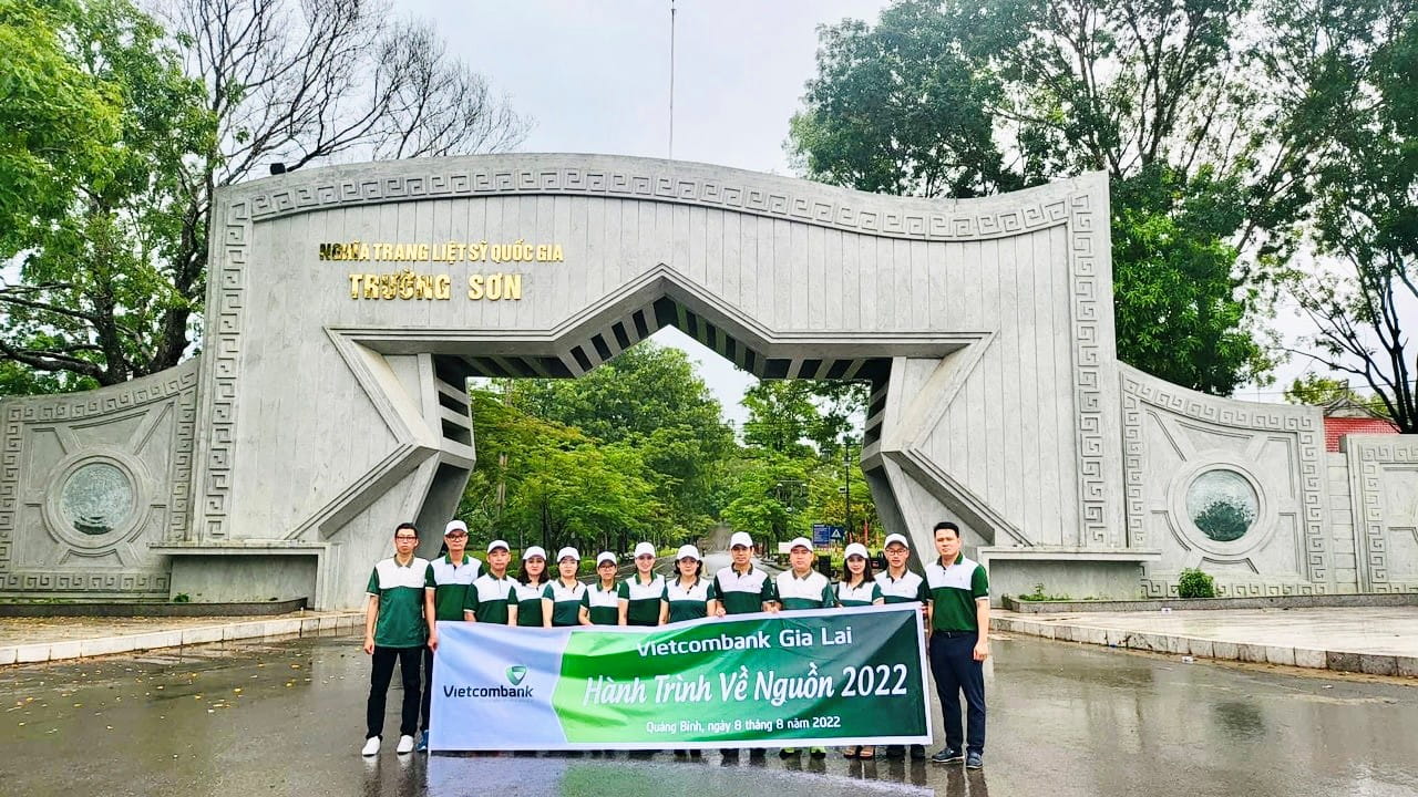 Đoàn về nguồn Vietcombank Gia Lai chụp hình lưu niệm tại nghĩa trang Quốc gia Trường Sơn. Bà Đỗ Thị Việt Hằng – Bí thư Đảng ủy, Giám đốc Vietcombank Gia Lai (thứ 6, từ phải sang), trưởng Đoàn
