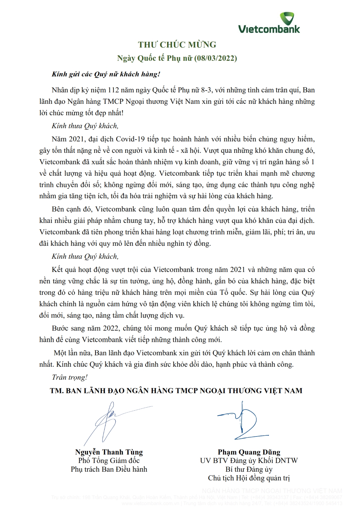 Nhân ngày Quốc tế Phụ nữ 8-3, Ban lãnh đạo Ngân hàng TMCP Ngoại thương Việt Nam gửi thư chúc mừng tới các Quý nữ khách hàng của Vietcombank.