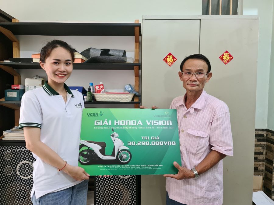 Theo kết quả quay thưởng của chương trình, ông Lê Thiêm Nghĩa ngụ tại Tp Thuận An, tỉnh Bình Dương – khách hàng của VCBR là 1 trong 15 khách hàng trên toàn hệ thống đã may mắn trúng thưởng 01 xe máy Honda Vision trị giá hơn 30 triệu VND.