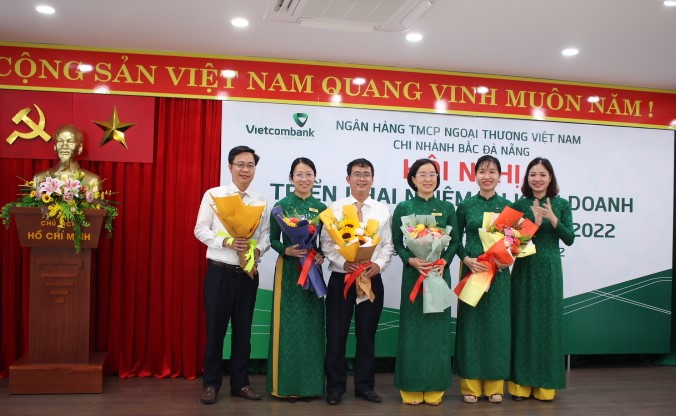 Bà Hoàng Thị Hằng - Bí thư Chi bộ, Giám đốc Chi nhánh (ngoài cùng bên phải) tặng hoa chúc mừng BCH lâm thời Công đoàn cơ sở Vietcombank Bắc Đà Nẵng
