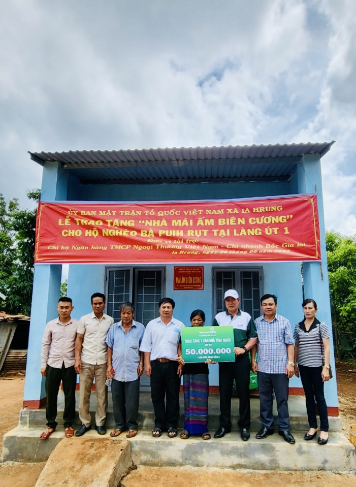 Sáng ngày 28/06/2022, Vietcombank Bắc Gia Lai phối hợp với các cơ quan ban ngành tại tỉnh Gia Lai đã tiến hành bàn giao và trao tặng 1 căn nhà trị giá 50 triệu đồng trong chương trình “Mái ấm biên cương” cho gia đình Bà Puih Rụt tại làng Út 1.