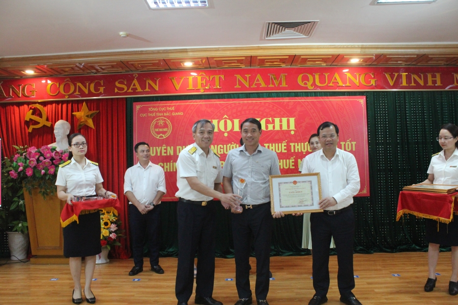 Tại Hội nghị, Cục thuế tỉnh Bắc Giang đã báo cáo về công tác thu ngân sách trên địa bàn tỉnh năm 2021. Theo đó, tổng thu ngân sách trên địa bàn tỉnh Bắc Giang đạt 22 nghìn tỷ đồng, đứng thứ 10 cả nước, bằng hơn 165% so với cùng kỳ. Có được kết quả này là do phần lớn các doanh nghiệp, cá nhân tích cực sản xuất kinh doanh, tuân thủ nghiêm việc nộp thuế. Để ghi nhận và động viên những đóng góp đó, Tổng cục thuế, Cục thuế tỉnh đã quyết định khen thưởng 87 doanh nghiệp, cá nhân tiêu biểu chọn ra từ 8.500 doanh nghiệp, HTX đang hoạt động kinh doanh. Trong đó, có 5 trường hợp được Tổng cục thuế tặng Giấy khen; 82 doanh nghiệp, cá nhân được Cục thuế tỉnh tặng Giấy khen.