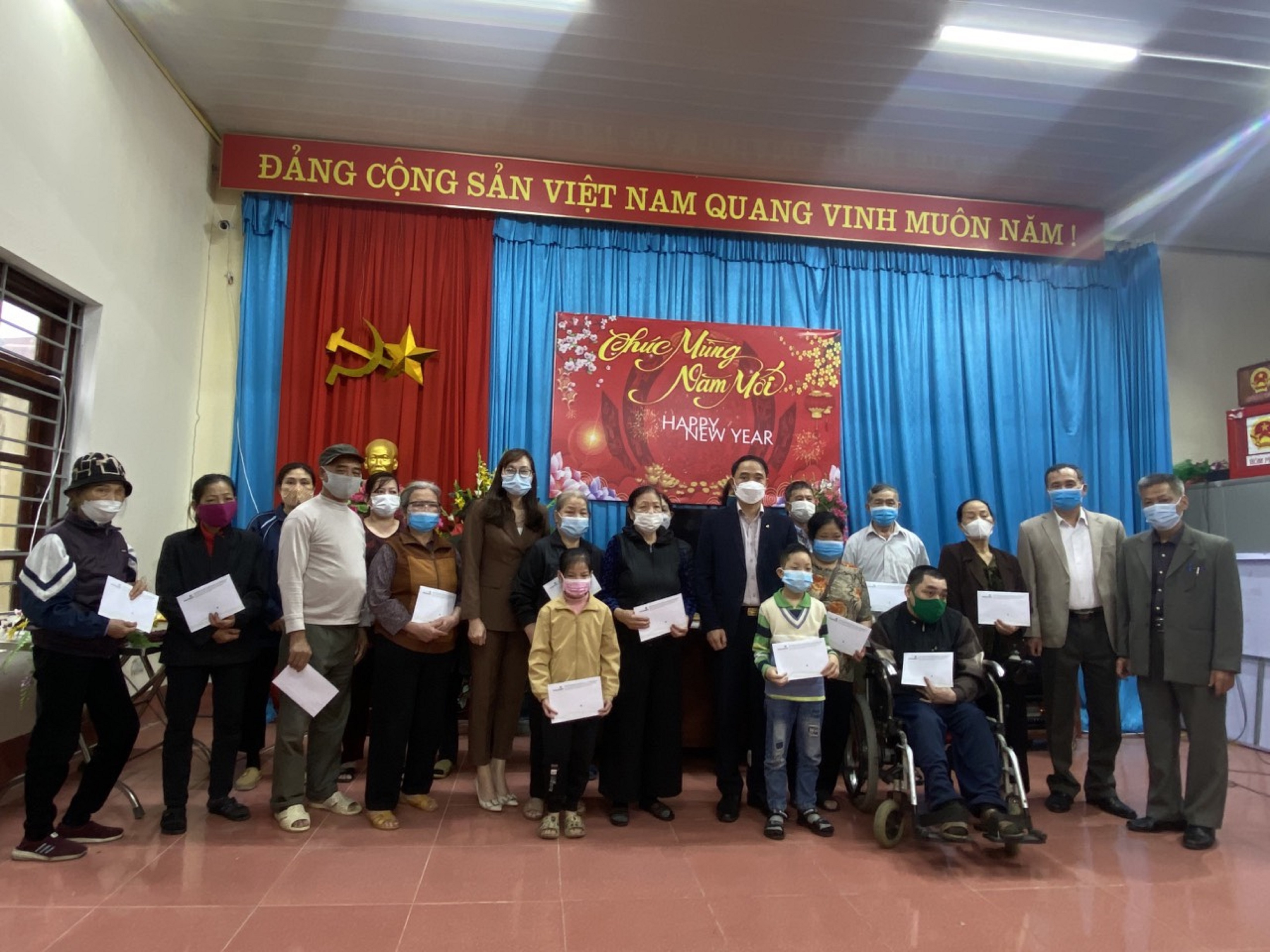 Ông Trần Xuân Dũng – Chủ tịch BCH Công đoàn, Phó Giám đốc Vietcombank Bắc Giang (ngoài cùng bên phải) thăm hỏi, trao quà Tết cho Mẹ VNAH Đồng Thị Nhâm